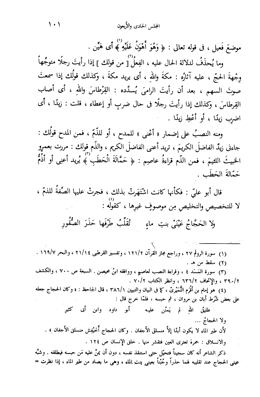 وما يحذف لدلالة الحال عليه، الفعل (¬2) [من قولك] إذا رأيت رجلا متوجّها وجهة الحجّ، عليه آثاره: مكة والله، أى يريد مكة، وكذلك قولك إذا سمعت صوت السهم، بعد أن رأيت الرامى يسدّده: القرطاس والله، أى أصاب القرطاس، وكذلك إذا رأيت رجلا فى حال ضرب أو إعطاء، قلت: زيدا، أى اضرب زيدا، أو أعط زيدا.
