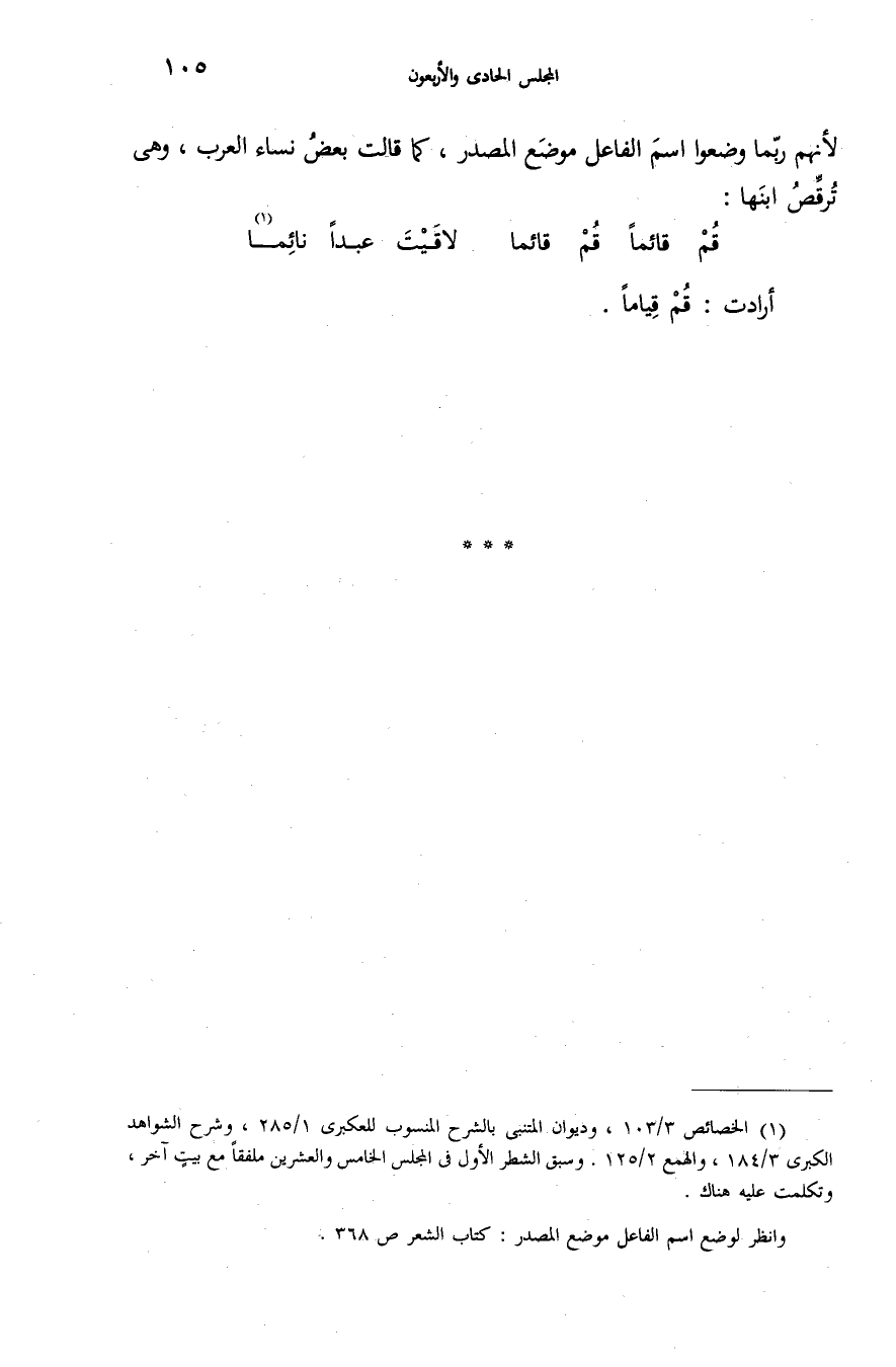 (¬1) الخصائص 3/ 103، وديوان المتنبى بالشرح المنسوب للعكبرى 1/ 285، وشرح الشواهد الكبرى 3/ 184، والهمع 2/ 125. وسبق الشطر الأول فى المجلس الخامس والعشرين ملفقا مع بيت آخر، وتكلمت عليه هناك. وانظر لوضع اسم الفاعل موضع المصدر: كتاب الشعر ص 368.