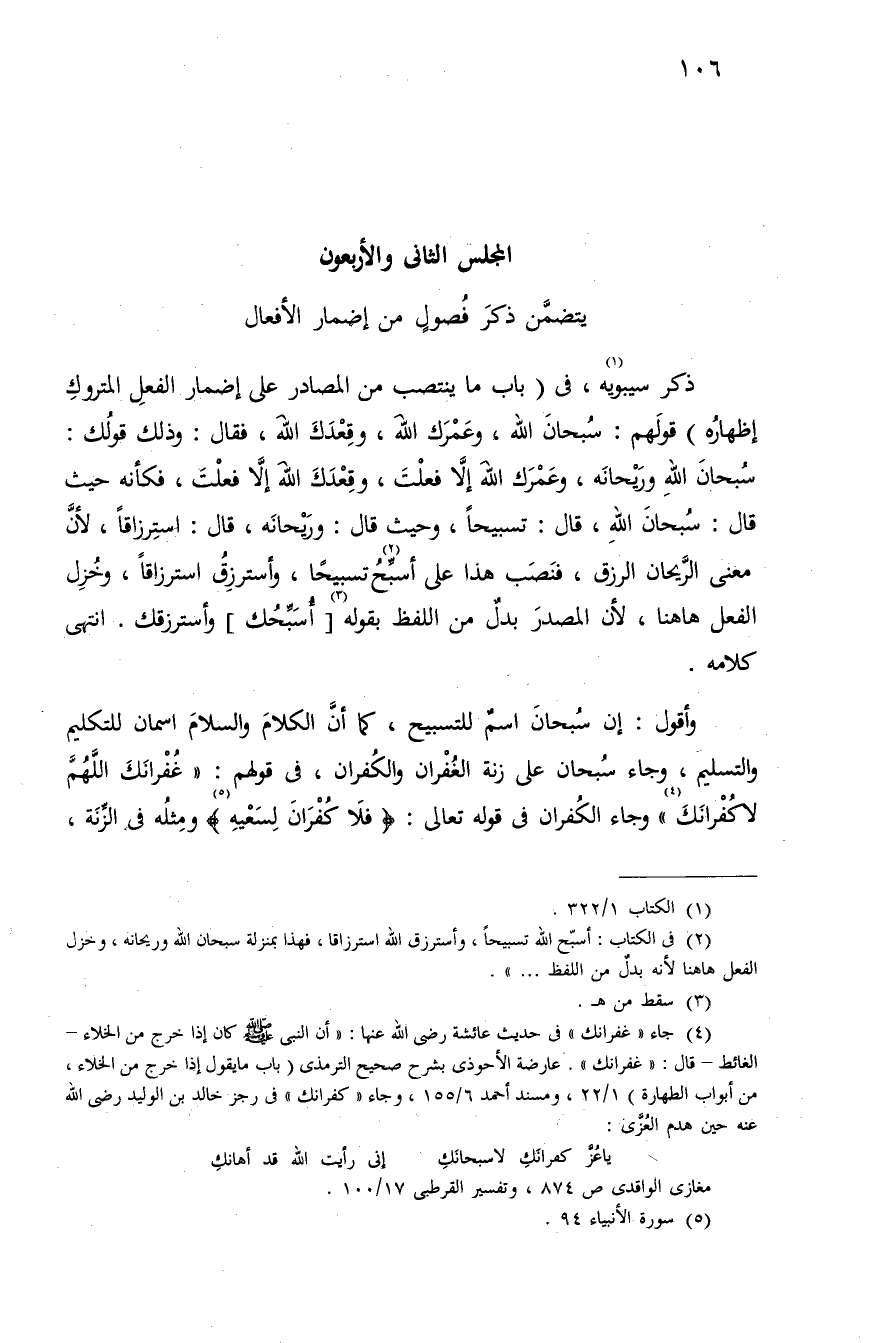 (¬2) فى الكتاب: أسبّح الله تسبيحا، وأسترزق الله استرزاقا، فهذا بمنزلة سبحان الله وريحانه، وخزل الفعل هاهنا لأنه بدل من اللفظ. . .».