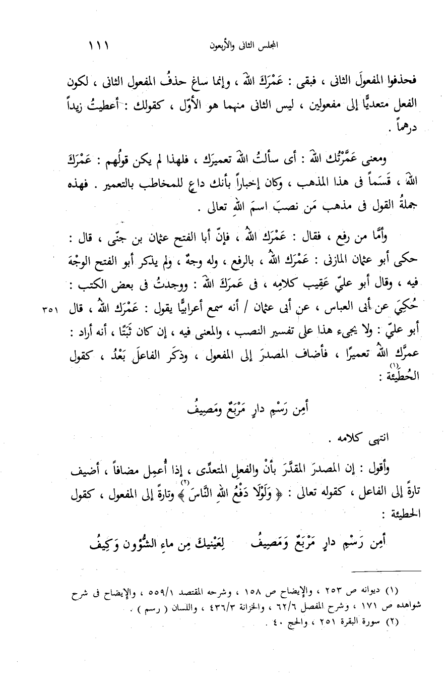 فحذفوا المفعول الثانى، فبقى: عمرك الله، وإنما ساغ حذف المفعول الثانى، لكون الفعل متعديا إلى مفعولين، ليس الثانى منهما هو الأوّل، كقولك: أعطيت زيدا درهما.