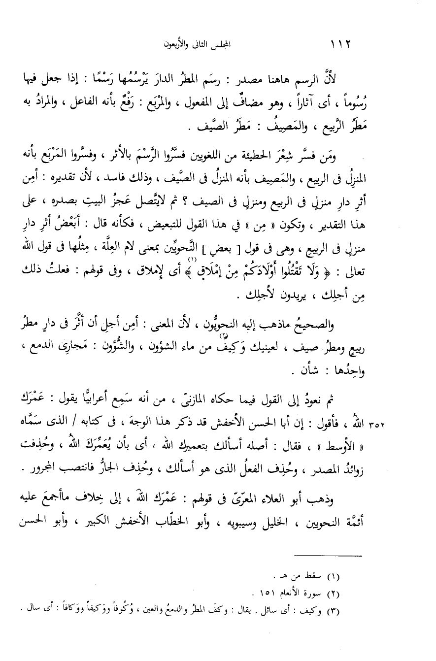 ومن فسّر شعر الحطيئة من اللغويين فسّروا الرّسم بالأثر، وفسّروا المربع بأنه المنزل فى الربيع، والمصيف بأنه المنزل فى الصّيف، وذلك فاسد، لأن تقديره: أمن أثر دار منزل فى الربيع ومنزل فى الصيف؟ ثم لا يتّصل عجز البيت بصدره، على هذا التقدير، وتكون «من» في هذا القول للتبعيض، فكأنه قال: أبعض أثر دار منزل فى الربيع، وهى فى قول [بعض] (¬1) النّحويّين بمعنى لام العلّة، مثلها فى قول الله تعالى: {وَلا تَقْتُلُوا أَوْلادَكُمْ مِنْ إِمْلاقٍ} (¬2) أى لإملاق، وفى قولهم: فعلت ذلك من أجلك، يريدون لأجلك.