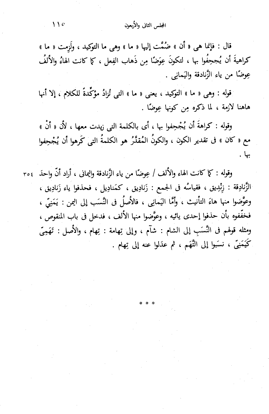 قال: فإنما هى «أن» ضمّت إليها «ما» وهى ما التوكيد، ولزمت «ما» كراهية أن يجحفوا بها، لتكون عوضا من ذهاب الفعل، كما كانت الهاء والألف عوضا من ياء الزّنادقة واليمانى.
