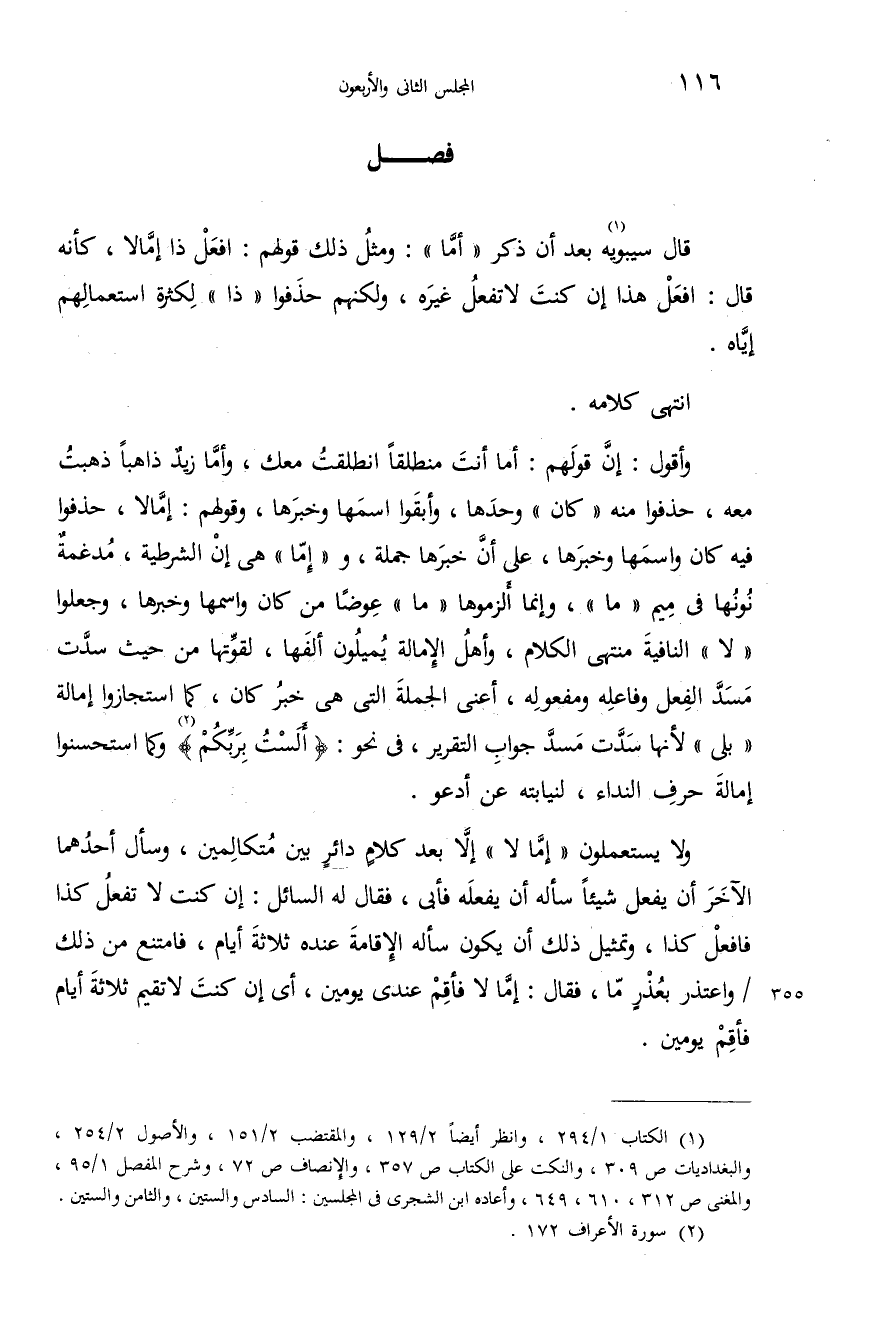 (¬1) الكتاب 1/ 294، وانظر أيضا 2/ 129، والمقتضب 2/ 151، والأصول 2/ 254، والبغداديات ص 309، والنكت على الكتاب ص 357، والإنصاف ص 72، وشرح المفصل 1/ 95، والمغنى ص 312،610،649، وأعاده ابن الشجرى فى المجلسين: السادس والستين، والثامن والستين.