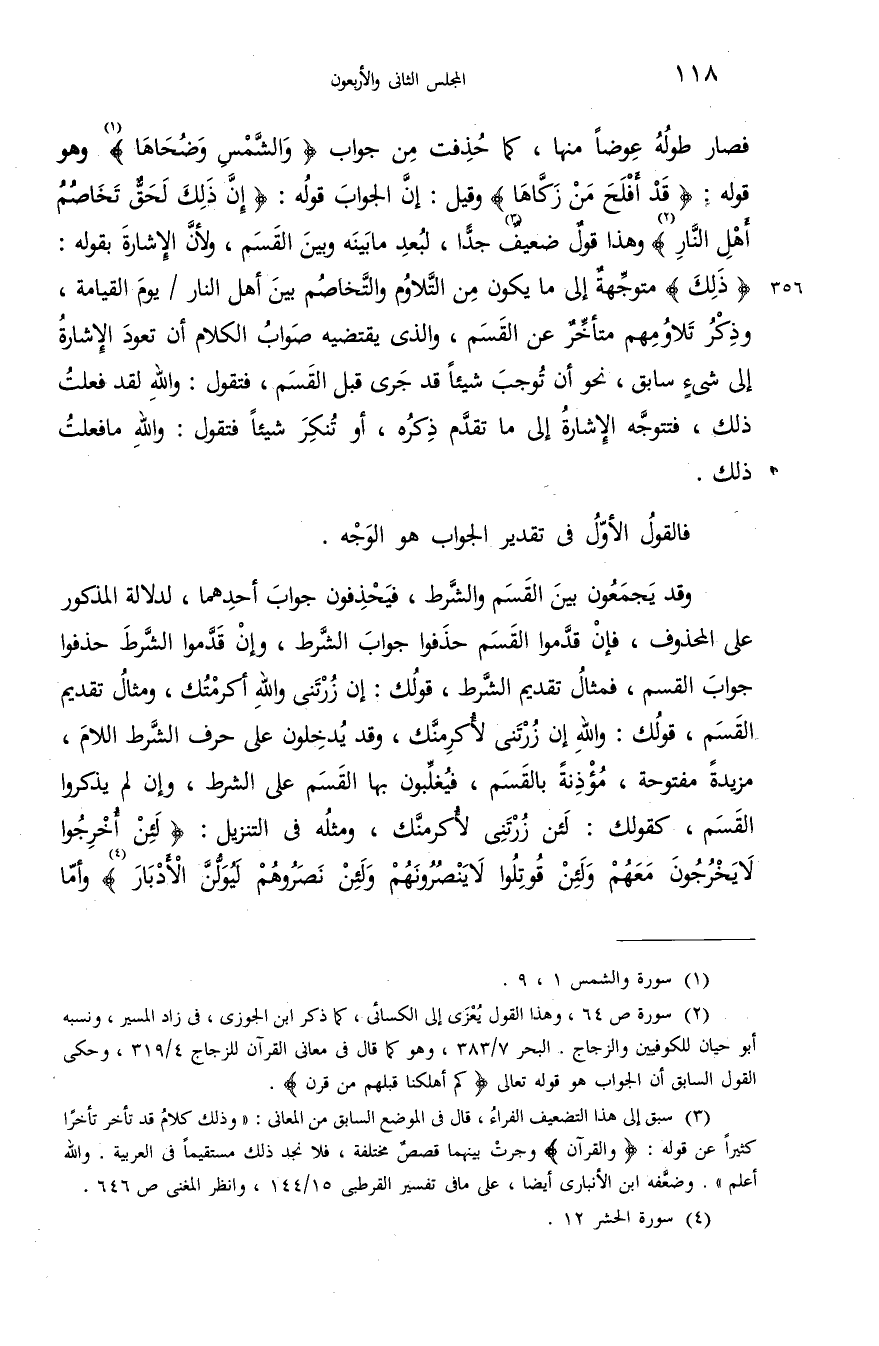 فصار طوله عوضا منها، كما حذفت من جواب {وَالشَّمْسِ وَضُحاها} (¬1) وهو قوله: {قَدْ أَفْلَحَ مَنْ زَكّاها} وقيل: إنّ الجواب قوله: {إِنَّ ذلِكَ لَحَقٌّ تَخاصُمُ أَهْلِ النّارِ} (¬2) وهذا قول ضعيف (¬3) جدّا، لبعد ما بينه وبين القسم، ولأنّ الإشارة بقوله: