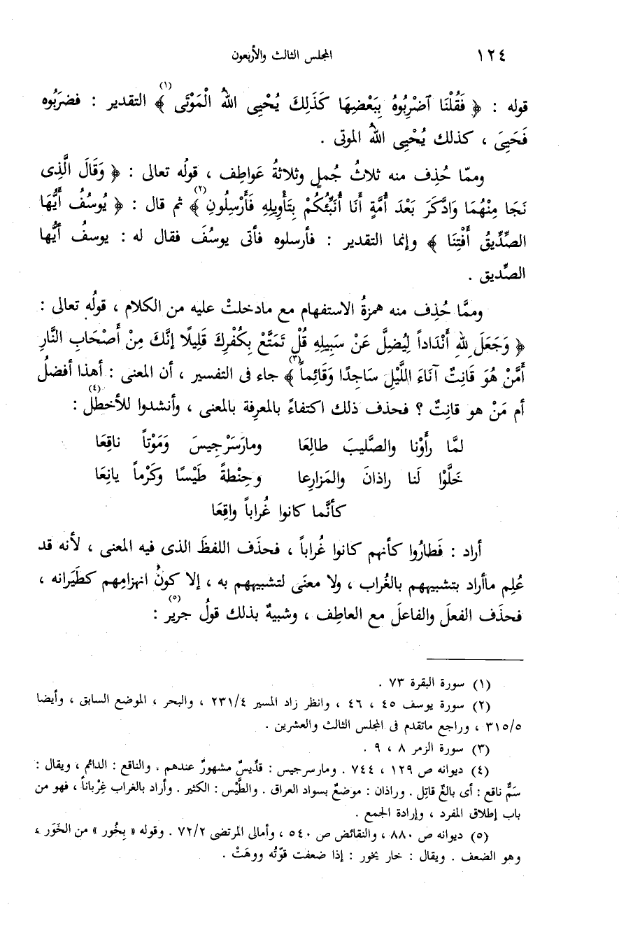 (¬2) سورة يوسف 45،46، وانظر زاد المسير 4/ 231، والبحر، الموضع السابق، وأيضا 5/ 315، وراجع ما تقدم فى المجلس الثالث والعشرين.