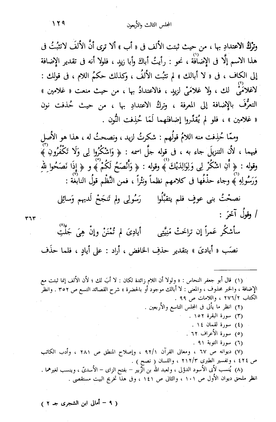 وممّا حذفت منه اللام قولهم: شكرت لزيد، ونصحت له، هذا هو الأصل فيهما، لأن التنزيل جاء به، فى قوله جلّ اسمه: {وَاُشْكُرُوا لِي وَلا تَكْفُرُونِ} (¬3) وقوله: {أَنِ اُشْكُرْ لِي وَلِوالِدَيْكَ} (¬4) وقوله: {وَأَنْصَحُ لَكُمْ} (¬5) و {إِذا نَصَحُوا لِلّهِ وَرَسُولِهِ} (¬6) وجاء حذفها فى كلامهم نظما ونثرا، فمن النّظم قول النابغة (¬7):