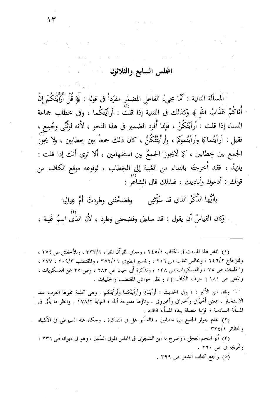 أمّا مجىء الفاعل المضمر مفردا فى قوله: {قُلْ أَرَأَيْتَكُمْ إِنْ أَتاكُمْ عَذابُ اللهِ} وكذلك فى التثنية إذا قلت (¬1): أرأيتكما، وفى خطاب جماعة النساء إذا قلت: أرأيتكنّ، فإنما أفرد الضمير فى هذا النحو، لأنه لو ثنّي وجمع، فقيل: أرأيتما كما وأ رأيتموكم، وأ رأيتنّكنّ، كان ذلك جمعا بين خطابين، ولا يجوز (¬2) الجمع بين خطابين، كما لا يجوز الجمع بين استفهامين، ألا ترى أنك إذا قلت: