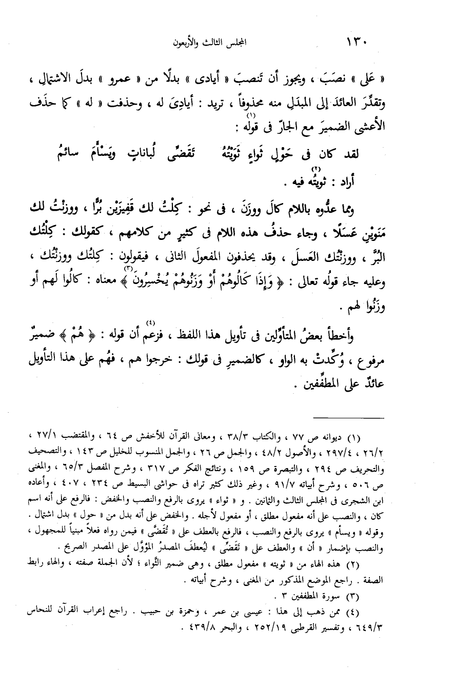 (¬1) ديوانه ص 77، والكتاب 3/ 38، ومعانى القرآن للأخفش ص 64، والمقتضب 1/ 27، 2/ 26،4/ 297، والأصول 2/ 48، والجمل ص 26، والجمل المنسوب للخليل ص 143، والتصحيف والتحريف ص 294، والتبصرة ص 159، ونتائج الفكر ص 317، وشرح المفصل 3/ 65، والمغنى ص 506، وشرح أبياته 7/ 91، وغير ذلك كثير تراه فى حواشى البسيط ص 234،407، وأعاده ابن الشجرى فى المجلس الثالث والثمانين. و «ثواء» يروى بالرفع والنصب والخفض: فالرفع على أنه اسم كان، والنصب على أنه مفعول مطلق، أو مفعول لأجله. والخفض على أنه بدل من «حول» بدل اشتمال. وقوله «ويسأم» يروى بالرفع والنصب، فالرفع بالعطف على «تقضّى» فيمن رواه فعلا مبنيا للمجهول، والنصب بإضمار «أن» والعطف على «تقضّى» ليعطف المصدر المؤوّل على المصدر الصريح.