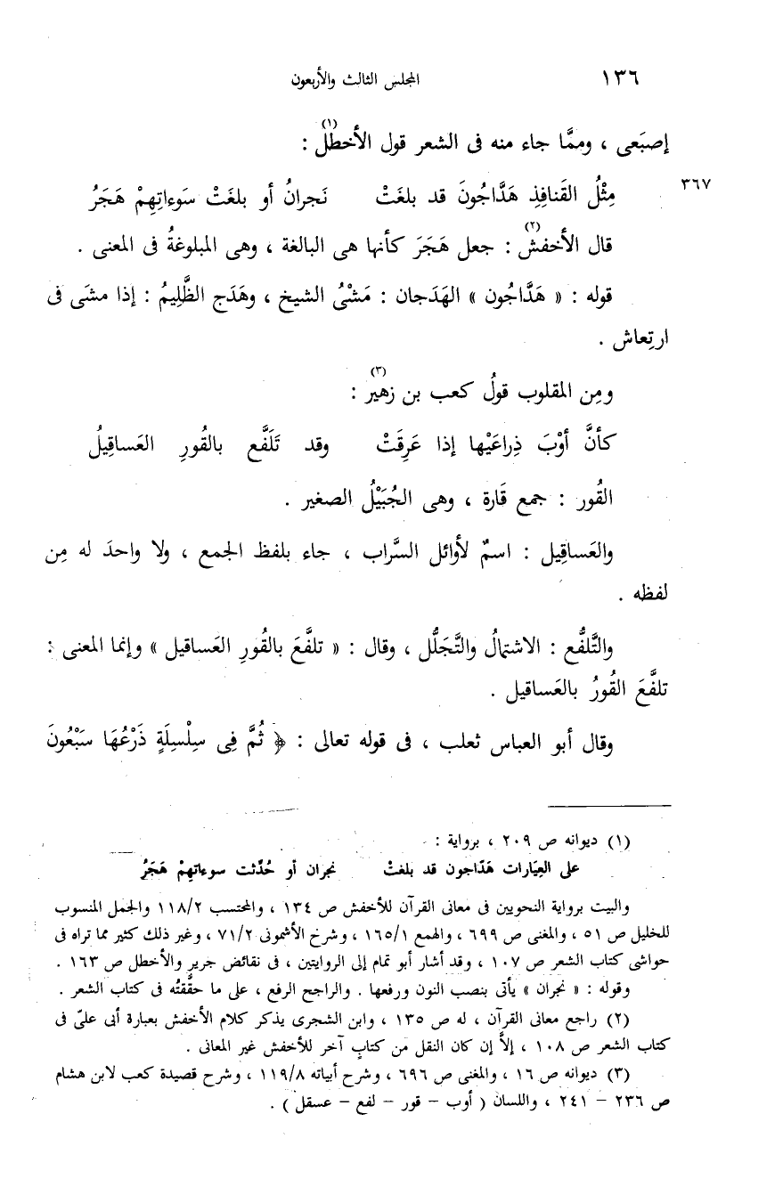 (¬2) راجع معانى القرآن، له ص 135، وابن الشجرى يذكر كلام الأخفش بعبارة أبى علىّ فى كتاب الشعر ص 108، إلاّ إن كان النقل من كتاب آخر للأخفش غير المعانى.