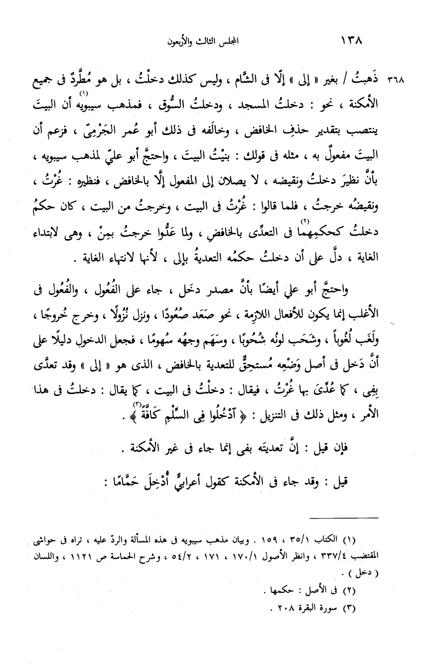 ذهبت/بغير «إلى» إلاّ فى الشّام، وليس كذلك دخلت، بل هو مطّرد فى جميع الأمكنة، نحو: دخلت المسجد، ودخلت السّوق، فمذهب سيبويه (¬1) أن البيت ينتصب بتقدير حذف الخافض، وخالفه فى ذلك أبو عمر الجرمىّ، فزعم أن البيت مفعول به، مثله فى قولك: بنيت البيت، واحتجّ أبو عليّ لمذهب سيبويه، بأنّ نظير دخلت ونقيضه، لا يصلان إلى المفعول إلاّ بالخافض، فنظيره: غرت، ونقيضه خرجت، فلما قالوا: غرت فى البيت، وخرجت من البيت، كان حكم دخلت كحكمهما (¬2) فى التعدّى بالخافض، ولما عدّوا خرجت بمن، وهى لابتداء الغاية، دلّ على أن دخلت حكمه التعدية بإلى، لأنها لانتهاء الغاية.