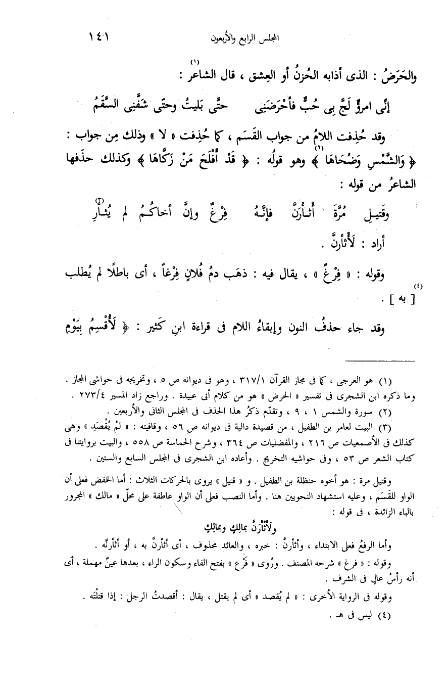 (¬2) سورة والشمس 1،9، وتقدّم ذكر هذا الحذف فى المجلس الثانى والأربعين.