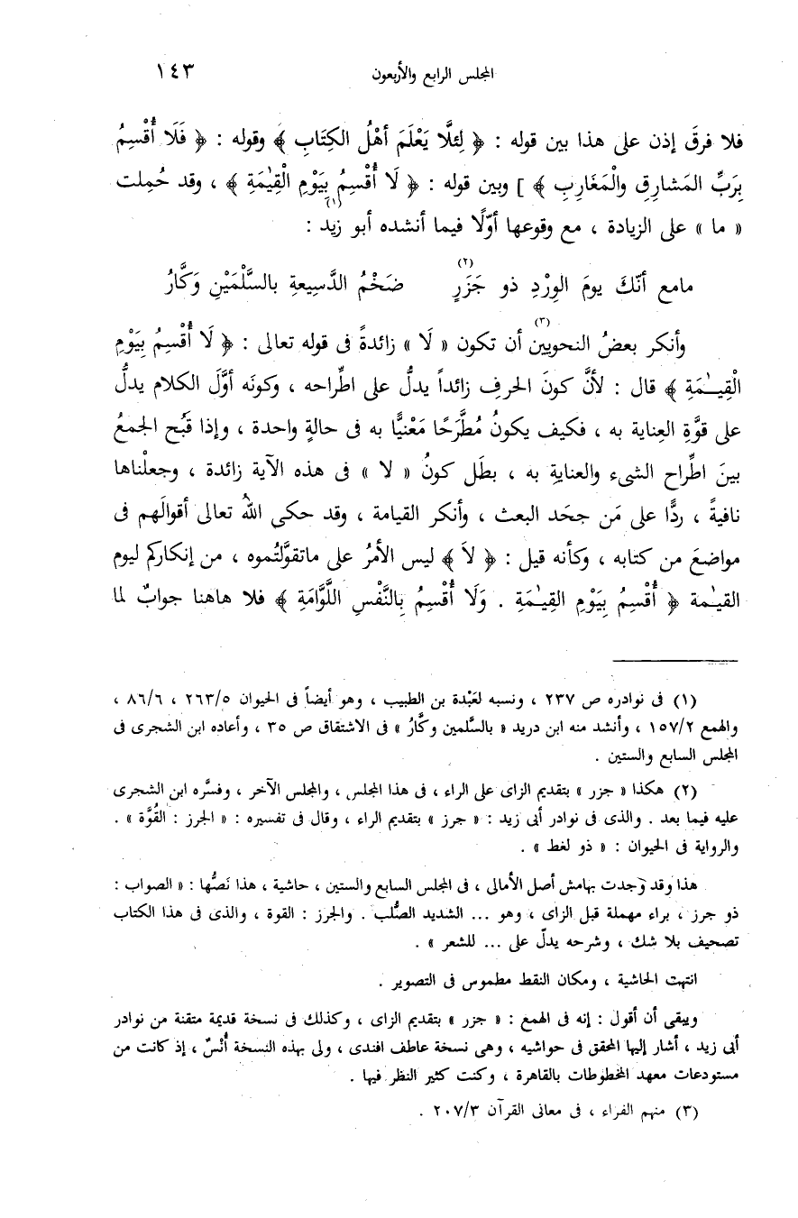 (¬2) هكذا «جزر» بتقديم الزاى على الراء، فى هذا المجلس، والمجلس الآخر، وفسّره ابن الشجرى عليه فيما بعد. والذى فى نوادر أبى زيد: «جرز» بتقديم الراء، وقال فى تفسيره: «الجرز: القوّة». والرواية فى الحيوان: «ذو لغط». هذا وقد وجدت بهامش أصل الأمالى، فى المجلس السابع والستين، حاشية، هذا نصّها: «الصواب: ذو جرز، براء مهملة قبل الزاى، وهو. . . الشديد الصّلب. والجرز: القوة، والذى فى هذا الكتاب تصحيف بلا شك، وشرحه يدلّ على. . . للشعر». انتهت الحاشية، ومكان النقط مطموس فى التصوير. ويبقى أن أقول: إنه فى الهمع: «جزر» بتقديم الزاى، وكذلك فى نسخة قديمة متقنة من نوادر أبى زيد، أشار إليها المحقق فى حواشيه، وهى نسخة عاطف افندى، ولي بهذه النسخة أنس، إذ كانت من مستودعات معهد المخطوطات بالقاهرة، وكنت كثير النظر فيها.