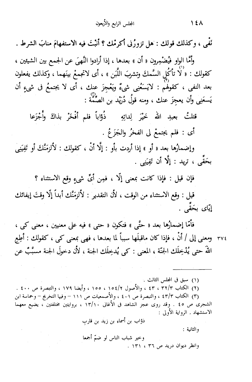 وأمّا الواو فيضمرون «أن» بعدها، إذا أرادوا النّهى عن الجمع بين الشيئين، كقولك: «لا (¬1) تأكل السّمك وتشرب اللّبن»، أى لا تجمع بينهما، وكذلك يفعلون بعد النفى، كقولهم (¬2): لا يسعنى شيء ويعجز عنك، أى لا يجتمع فى شيء أن يسعنى وأن يعجز عنك، ومنه قول دريد بن الصّمّة (¬3):