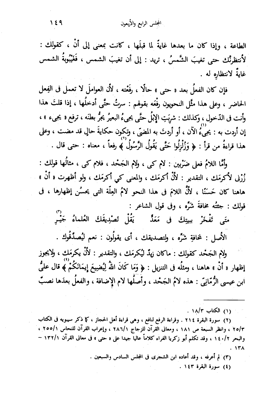 (¬2) سورة البقرة 214. وقراءة الرفع لنافع، وهى قراءة أهل الحجاز، كما ذكر سيبويه فى الكتاب 3/ 25، وانظر السبعة ص 181، ومعانى القرآن للزجاج 1/ 286، وإعراب القرآن للنحاس 1/ 255، والبحر 2/ 140، وقد تكلم أبو زكريا الفراء كلاما عاليا جيدا على «حتى» فى معانى القرآن 1/ 132 - 138.