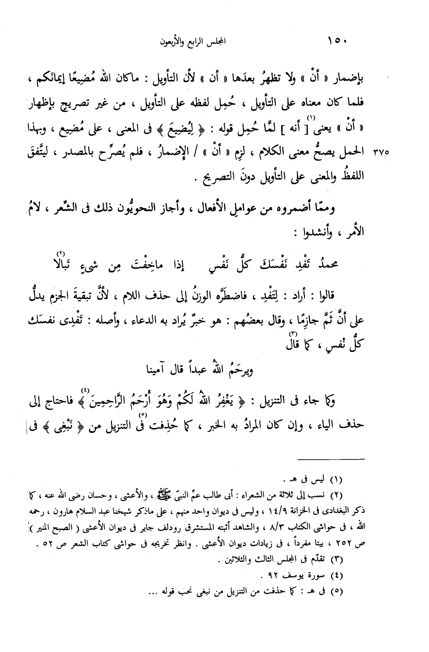 (¬2) نسب إلى ثلاثة من الشعراء: أبى طالب عمّ النبىّ صلّى الله عليه وسلم، والأعشى، وحسان رضى الله عنه، كما ذكر البغدادى فى الخزانة 9/ 14، وليس فى ديوان واحد منهم، على ما ذكر شيخنا عبد السلام هارون، رحمه الله، فى حواشى الكتاب 3/ 8، والشاهد أثبته المستشرق رودلف جاير فى ديوان الأعشى (الصبح المنير) ص 252، بيتا مفردا، فى زيادات ديوان الأعشى. وانظر تخريجه فى حواشى كتاب الشعر ص 52.