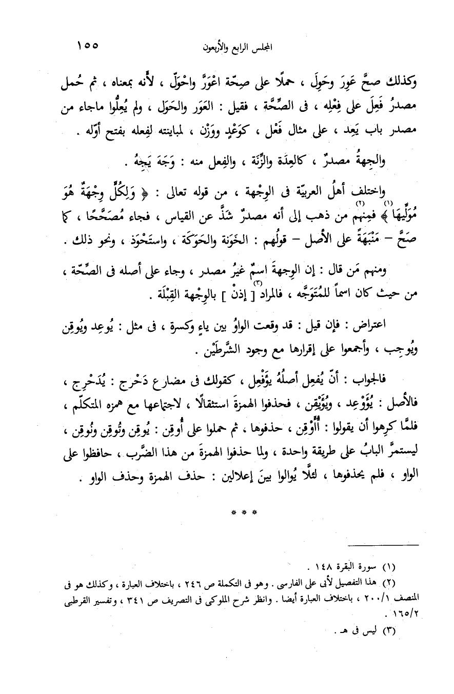واختلف أهل العربيّة فى الوجهة، من قوله تعالى: {وَلِكُلٍّ وِجْهَةٌ هُوَ مُوَلِّيها} (¬1) فمنهم (¬2) من ذهب إلى أنه مصدر شذّ عن القياس، فجاء مصحّحا، كما صحّ-منبهة على الأصل-قولهم: الخونة والحوكة، واستحوذ، ونحو ذلك.