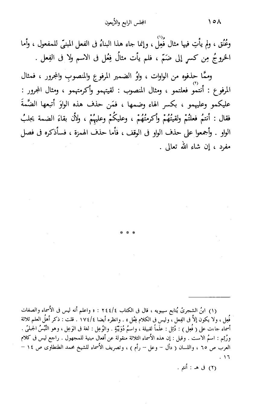 (¬1) ابن الشجرىّ يتابع سيبويه، قال فى الكتاب 4/ 244: «واعلم أنه ليس فى الأسماء والصفات فعل، ولا يكون إلاّ فى الفعل». وليس فى الكلام فعل». وانظره أيضا 4/ 174. قلت: ذكر أهل العلم ثلاثة أسماء جاءت على (فعل): دئل: علما لقبيلة، واسم دويبّة. والوعل: لغة فى الوعل، وهو التّيس الجبلىّ. ورئم: اسم الاست. وقيل: إن هذه الأسماء الثلاثة منقولة عن أفعال مبنية للمجهول. راجع ليس فى كلام العرب ص 65، واللسان (دأل-وعل -رأم)، وتصريف الأسماء للشيخ محمد الطنطاوى ص 14 - 16.