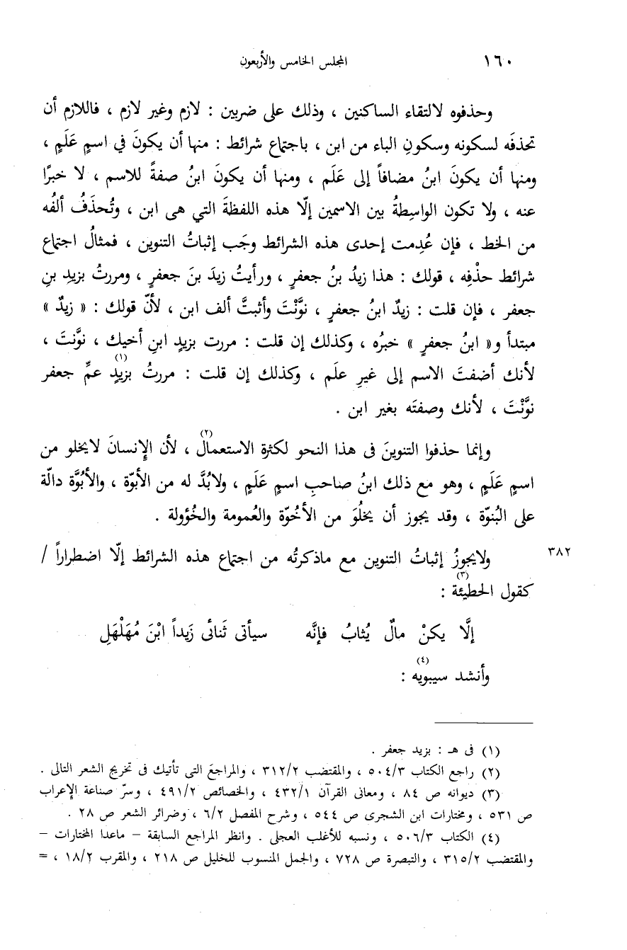 وحذفوه لالتقاء الساكنين، وذلك على ضربين: لازم وغير لازم، فاللازم أن تحذفه لسكونه وسكون الباء من ابن، باجتماع شرائط: منها أن يكون في اسم علم، ومنها أن يكون ابن مضافا إلى علم، ومنها أن يكون ابن صفة للاسم، لا خبرا عنه، ولا تكون الواسطة بين الاسمين إلاّ هذه اللفظة التي هى ابن، وتحذف ألفه من الخط، فإن عدمت إحدى هذه الشرائط وجب إثبات التنوين، فمثال اجتماع شرائط حذفه، قولك: هذا زيد بن جعفر، ورأيت زيد بن جعفر، ومررت بزيد بن جعفر، فإن قلت: زيد ابن جعفر، نوّنت وأثبتّ ألف ابن، لأنّ قولك: «زيد» مبتدأ و «ابن جعفر» خبره، وكذلك إن قلت: مررت بزيد ابن أخيك، نوّنت، لأنك أضفت الاسم إلى غير علم، وكذلك إن قلت: مررت بزيد (¬1) عمّ جعفر نوّنت، لأنك وصفته بغير ابن.