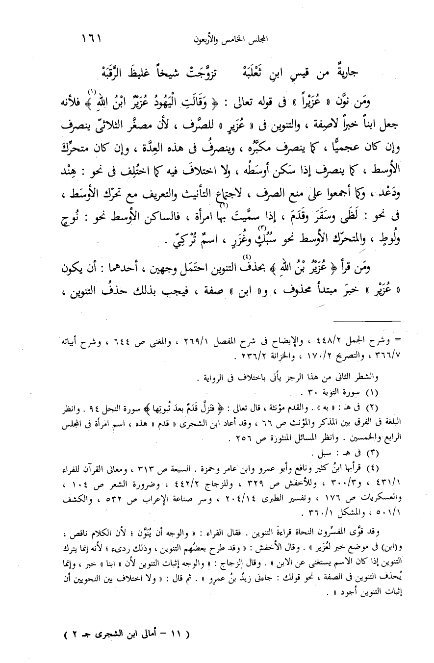 ومن قرأ {عُزَيْرٌ اِبْنُ اللهِ} بحذف (¬4) التنوين احتمل وجهين، أحدهما: أن يكون «عزير» خبر مبتدأ محذوف، و «ابن» صفة، فيجب بذلك حذف التنوين،