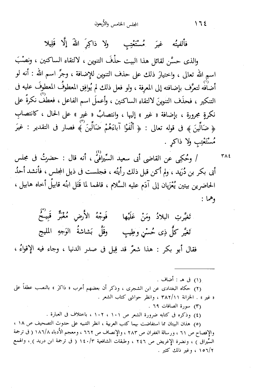 (¬5) هذان البيتان مما استفاضت بهما كتب العربية، انظر التنبيه على حدوث التصحيف ص 18، والإفصاح ص 61، ورسالة الغفران ص 283، والإنصاف ص 662، ومعجم الأدباء 8/ 186 (فى ترجمة السّيرافى)، ونضرة الإغريض ص 246، وطبقات الشافعية 3/ 140 (فى ترجمة ابن دريد)، والهمع 2/ 156، وغير ذلك كثير.