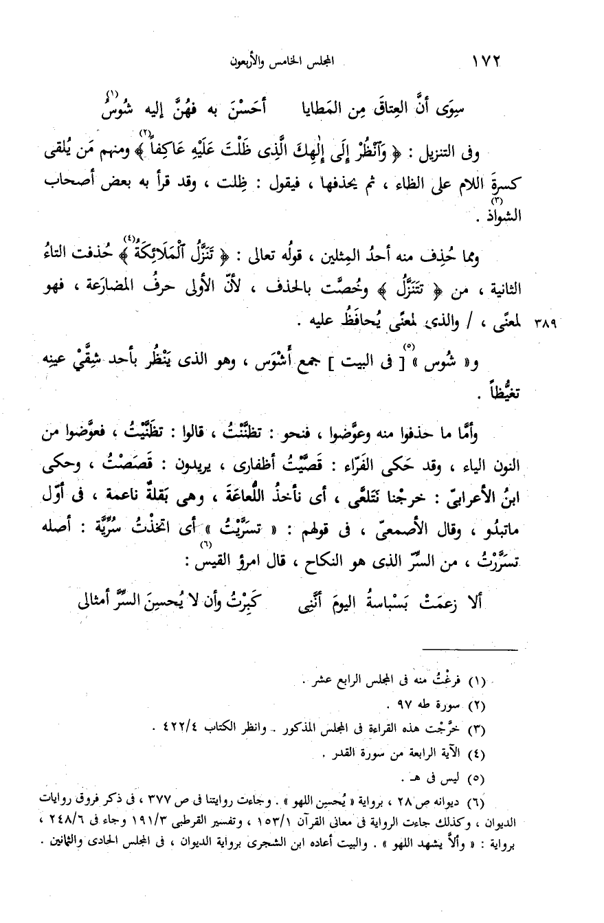 (¬6) ديوانه ص 28، برواية «يحسن اللهو». وجاءت روايتنا فى ص 377، فى ذكر فروق روايات الديوان، وكذلك جاءت الرواية فى معانى القرآن 1/ 153، وتفسير القرطبى 3/ 191 وجاء فى 6/ 248، برواية: «وألاّ يشهد اللهو». والبيت أعاده ابن الشجرى برواية الديوان، فى المجلس الحادى والثمانين.