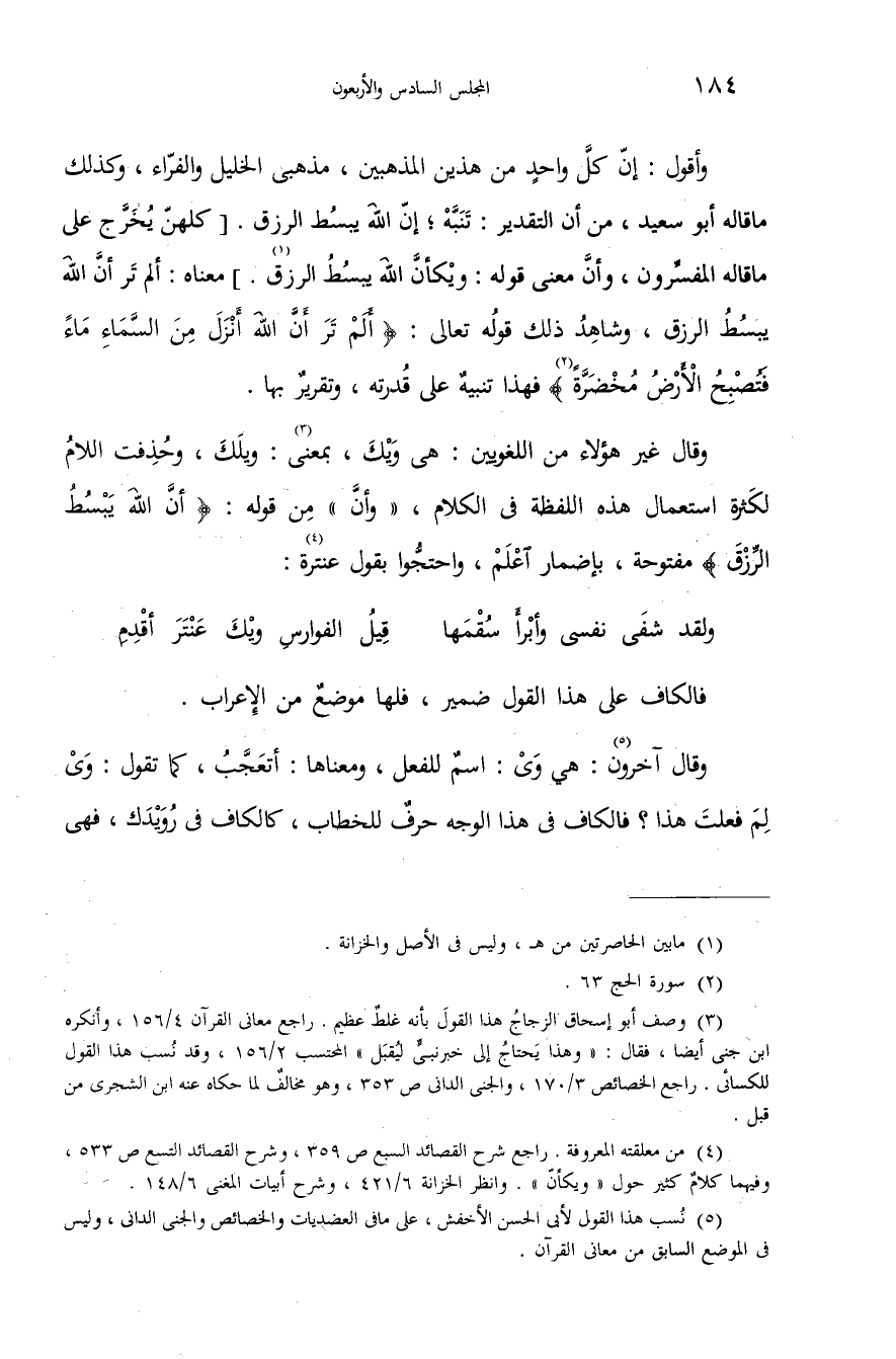 وأقول: إنّ كلّ واحد من هذين المذهبين، مذهبى الخليل والفرّاء، وكذلك ما قاله أبو سعيد، من أن التقدير: تنبّه؛ إنّ الله يبسط الرزق. [كلهنّ يخرّج على ما قاله المفسّرون، وأنّ معنى قوله: ويكأنّ الله يبسط الرزق (¬1).] معناه: ألم تر أنّ الله يبسط الرزق، وشاهد ذلك قوله تعالى: {أَلَمْ تَرَ أَنَّ اللهَ أَنْزَلَ مِنَ السَّماءِ ماءً فَتُصْبِحُ الْأَرْضُ مُخْضَرَّةً} (¬2) فهذا تنبيه على قدرته، وتقرير بها.