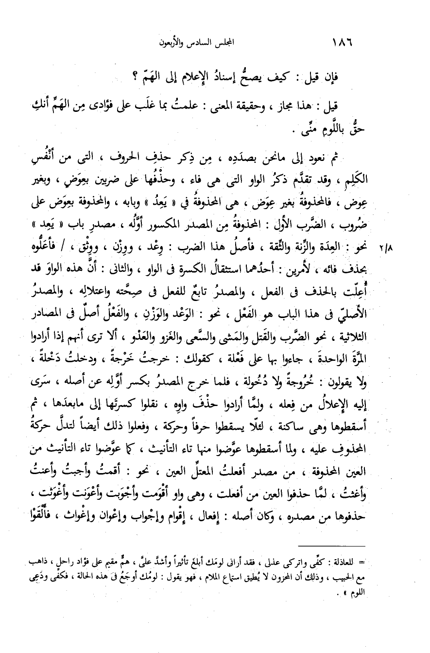 ثم نعود إلى ما نحن بصدده، من ذكر حذف الحروف، التى من أنفس الكلم، وقد تقدّم ذكر الواو التى هى فاء، وحذفها على ضربين بعوض، وبغير عوض، فالمحذوفة بغير عوض، هى المحذوفة في «يعد» وبابه، والمحذوفة بعوض على ضروب، الضّرب الأول: المحذوفة من المصدر المكسور أوّله، مصدر باب «يعد» نحو: العدة والزّنة والثّقة، فأصل هذا الضرب: وعد، ووزن، ووثق، /فأعلّوه بحذف فائه، لأمرين: أحدهما استثقال الكسرة فى الواو، والثانى: أنّ هذه الواو قد أعلّت بالحذف فى الفعل، والمصدر تابع للفعل فى صحّته واعتلاله، والمصدر الأصليّ فى هذا الباب هو الفعل، نحو: الوعد والوزن، والفعل أصل فى المصادر الثلاثية، نحو الضّرب والقتل والمشى والسّعى والغزو والعدو، ألا ترى أنهم إذا أرادوا المرّة الواحدة، جاءوا بها على فعلة، كقولك: خرجت خرجة، ودخلت دخلة، ولا يقولون: خروجة ولا دخولة، فلما خرج المصدر بكسر أوّله عن أصله، سرى إليه الإعلال من فعله، ولمّا أرادوا حذف واوه، نقلوا كسرتها إلى ما بعدها، ثم أسقطوها وهى ساكنة، لئلاّ يسقطوا حرفا وحركة، وفعلوا ذلك أيضا لتدلّ حركة المحذوف عليه، ولما أسقطوها عوّضوا منها تاء التأنيث، كما عوّضوا تاء
