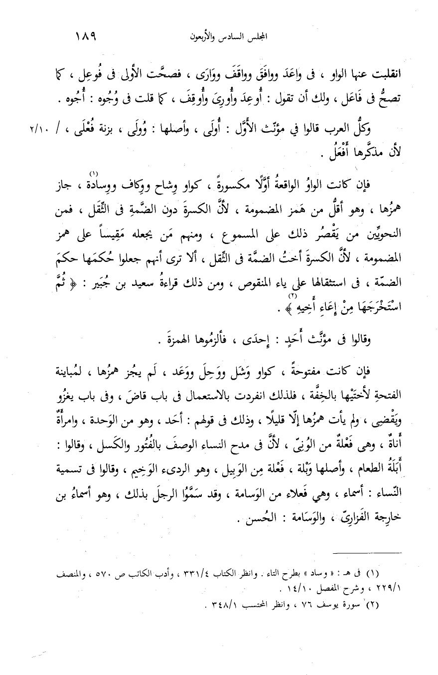 فإن كانت الواو الواقعة أوّلا مكسورة، كواو وشاح ووكاف ووسادة (¬1)، جاز همزها، وهو أقلّ من همز المضمومة، لأنّ الكسرة دون الضّمة فى الثّقل، فمن النحويّين من يقصر ذلك على المسموع، ومنهم من يجعله مقيسا على همز المضمومة، لأنّ الكسرة أخت الضمّة فى الثّقل، ألا ترى أنهم جعلوا حكمها حكم الضمّة، فى استثقالها على ياء المنقوص، ومن ذلك قراءة سعيد بن جبير: «ثمّ استخرجها من إعاء أخيه» (¬2).