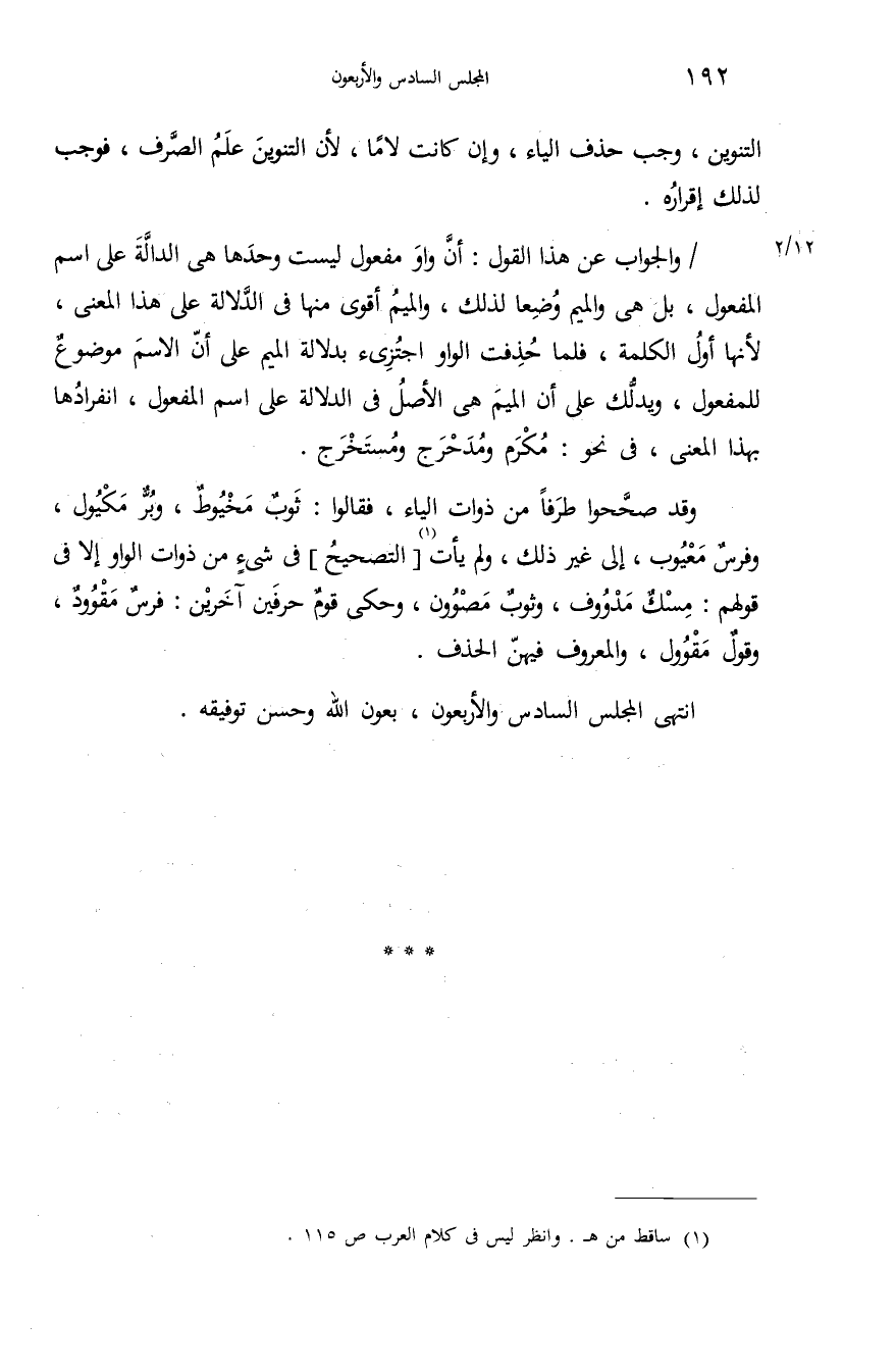 /والجواب عن هذا القول: أنّ واو مفعول ليست وحدها هى الدالّة على اسم المفعول، بل هى والميم وضعا لذلك، والميم أقوى منها فى الدّلالة على هذا المعنى، لأنها أول الكلمة، فلما حذفت الواو اجتزئ بدلالة الميم على أنّ الاسم موضوع للمفعول، ويدلّك على أن الميم هى الأصل فى الدلالة على اسم المفعول، انفرادها بهذا المعنى، فى نحو: مكرم ومدحرج ومستخرج.