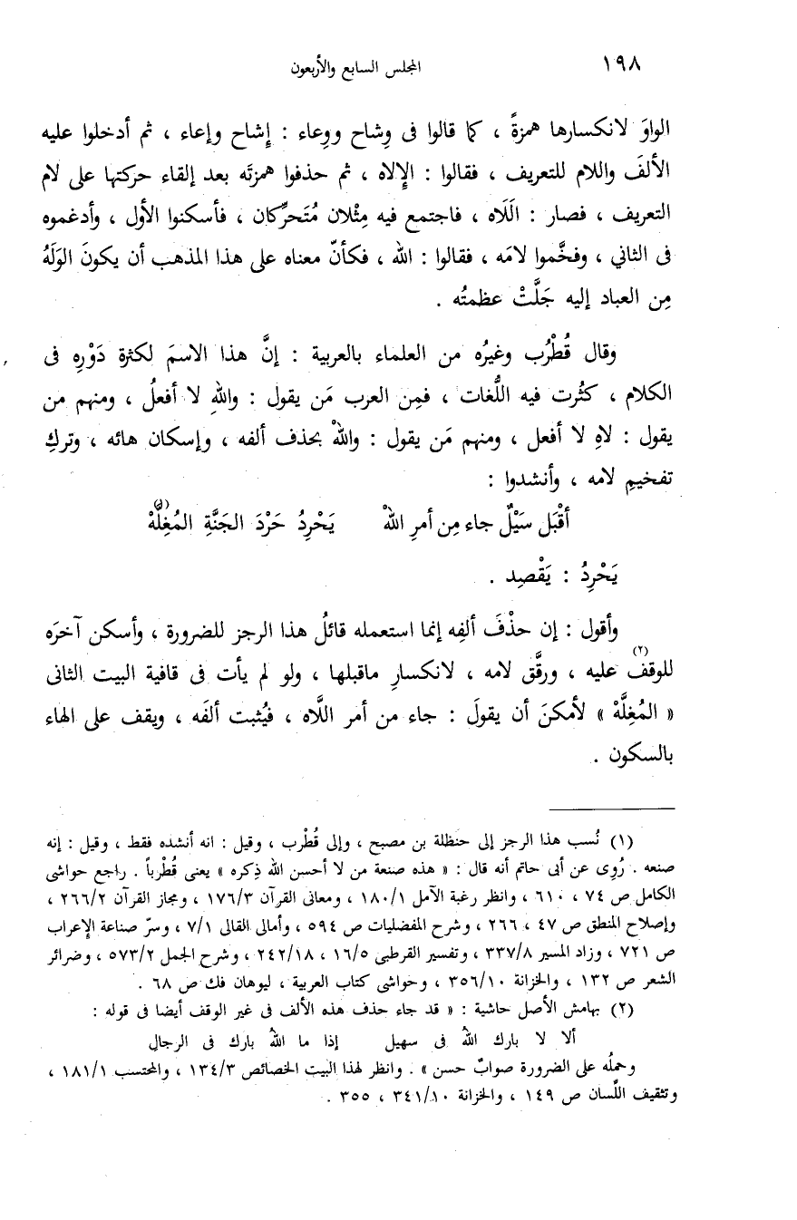 (¬2) بهامش الأصل حاشية: «قد جاء حذف هذه الألف فى غير الوقف أيضا فى قوله: ألا لا بارك الله فى سهيل إذا ما الله بارك فى الرجال وحمله على الضرورة صواب حسن». وانظر لهذا البيت الخصائص 3/ 134، والمحتسب 1/ 181، وتثقيف اللّسان ص 149، والخزانة 10/ 341،355.