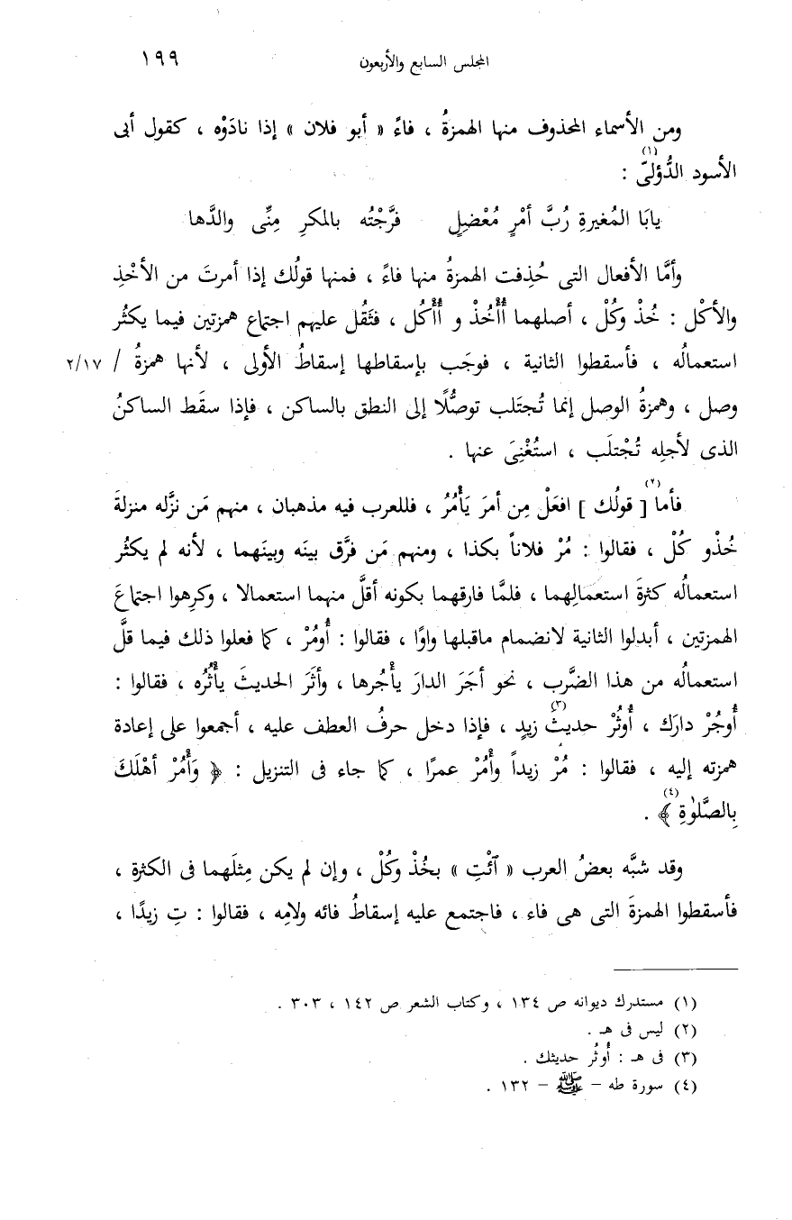 أوجر دارك، أوثر حديث (¬3) زيد، فإذا دخل حرف العطف عليه، أجمعوا على إعادة همزته إليه، فقالوا: مر زيدا وأمر عمرا، كما جاء فى التنزيل: {وَأْمُرْ أَهْلَكَ بِالصَّلاةِ} (¬4).