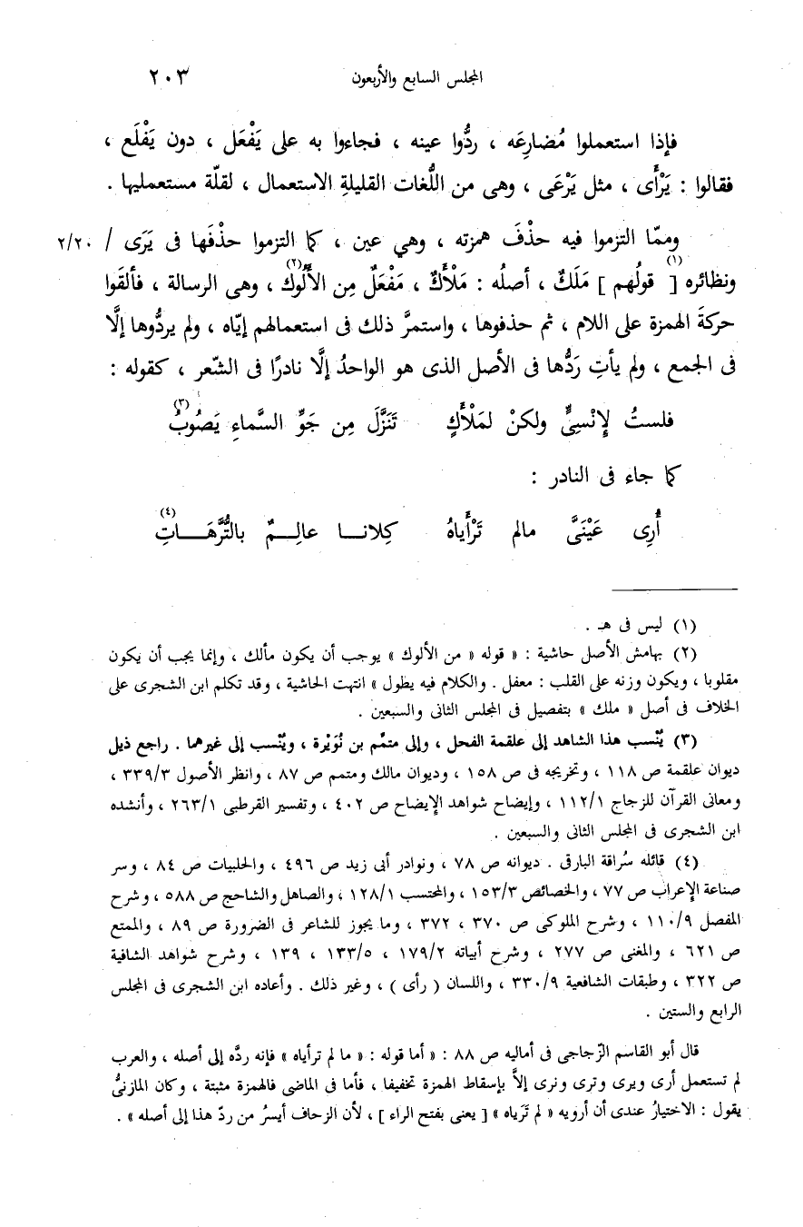 (¬2) بهامش الأصل حاشية: «قوله «من الألوك» يوجب أن يكون مألك، وإنما يجب أن يكون مقلوبا، ويكون وزنه على القلب: معفل. والكلام فيه يطول» انتهت الحاشية، وقد تكلم ابن الشجرى على الخلاف فى أصل «ملك» بتفصيل فى المجلس الثانى والسبعين.