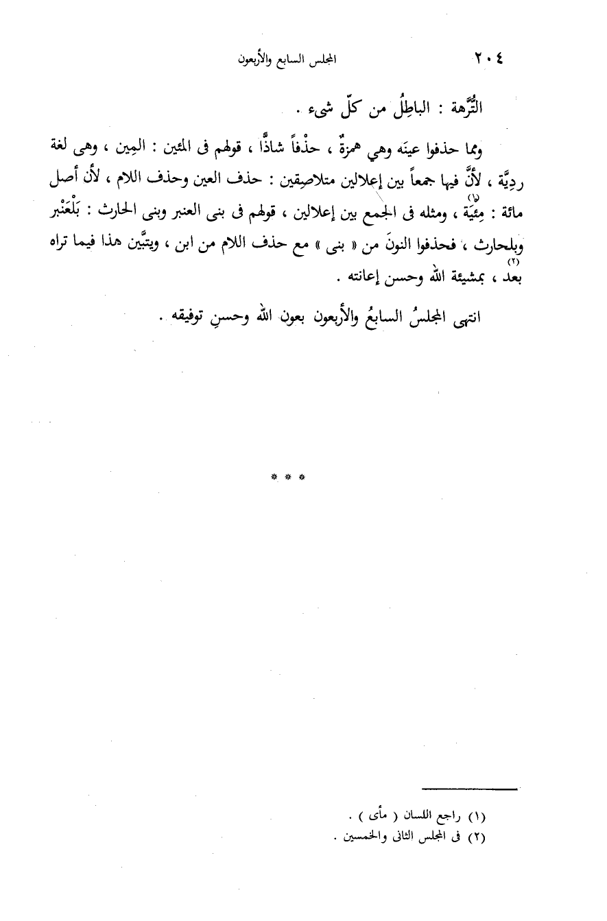 ومما حذفوا عينه وهي همزة، حذفا شاذّا، قولهم فى المئين: المين، وهى لغة رديّة، لأنّ فيها جمعا بين إعلالين متلاصقين: حذف العين وحذف اللام، لأن أصل مائة: مئية (¬1)، ومثله فى الجمع بين إعلالين، قولهم فى بنى العنبر وبنى الحارث: بلعنبر وبلحارث، فحذفوا النون من «بنى» مع حذف اللام من ابن، ويتبيّن هذا فيما تراه بعد (¬2)، بمشيئة الله وحسن إعانته.