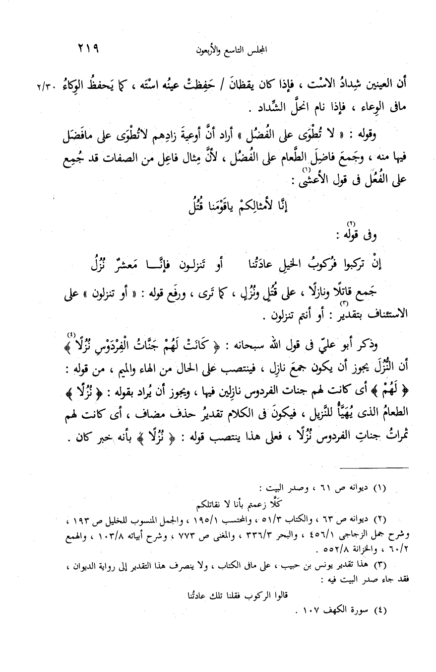 وذكر أبو عليّ فى قول الله سبحانه: {كانَتْ لَهُمْ جَنّاتُ الْفِرْدَوْسِ نُزُلاً} (¬4) أن النّزل يجوز أن يكون جمع نازل، فينتصب على الحال من الهاء والميم، من قوله:
