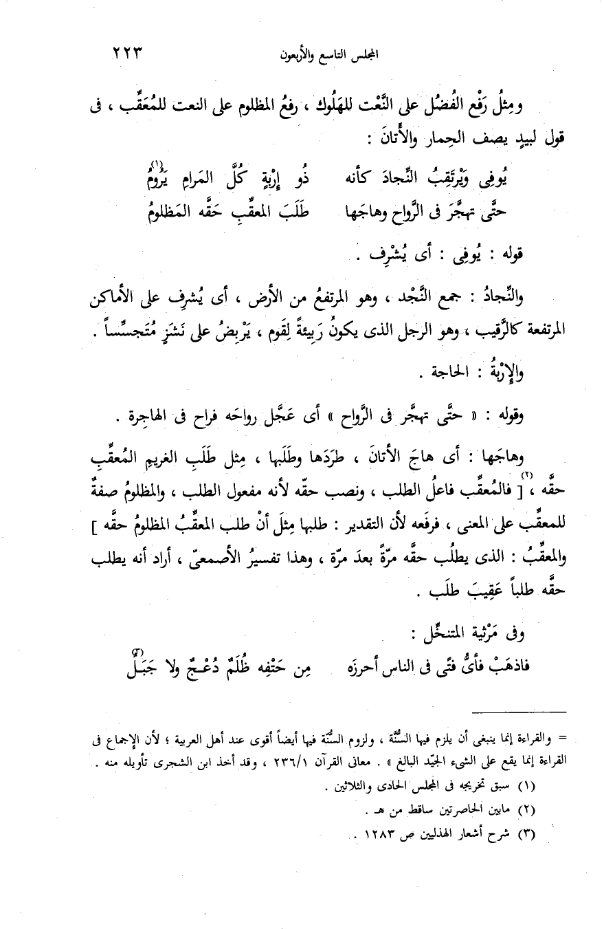 وهاجها: أى هاج الأتان، طردها وطلبها، مثل طلب الغريم المعقّب حقّه، (¬2) [فالمعقّب فاعل الطلب، ونصب حقّه لأنه مفعول الطلب، والمظلوم صفة للمعقّب على المعنى، فرفعه لأن التقدير: طلبها مثل أن طلب المعقّب المظلوم حقّه] والمعقّب: الذى يطلب حقّه مرّة بعد مرّة، وهذا تفسير الأصمعىّ، أراد أنه يطلب حقّه طلبا عقيب طلب.