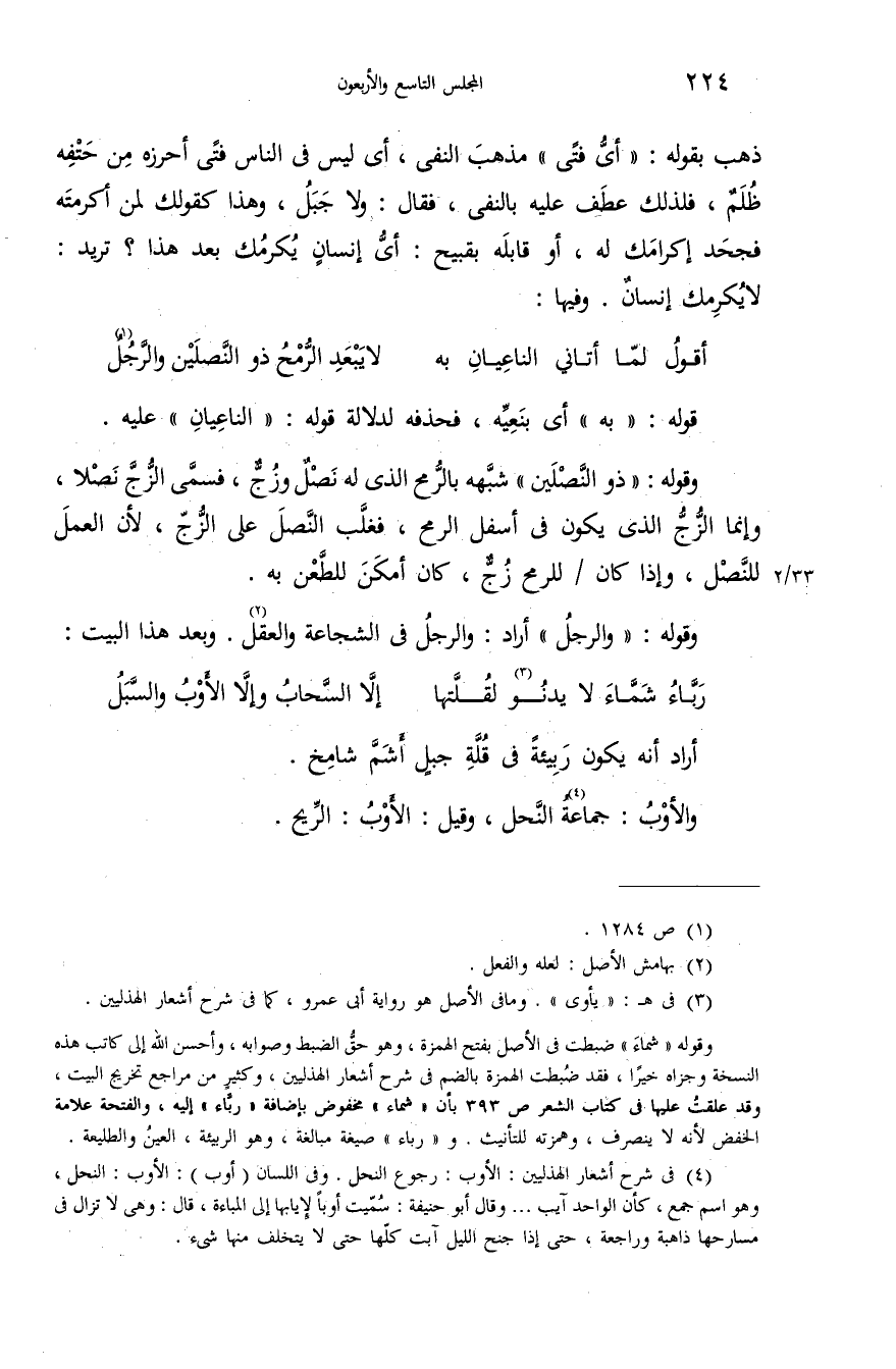 (¬4) فى شرح أشعار الهذليين: الأوب: رجوع النحل. وفى اللسان (أوب): الأوب: النحل، وهو اسم جمع، كأن الواحد آئب. . . وقال أبو حنيفة: سمّيت أوبا لإيابها إلى المباءة، قال: وهى لا تزال فى مسارحها ذاهبة وراجعة، حتى إذا جنح الليل آبت كلّها حتى لا يتخلف منها شيء.