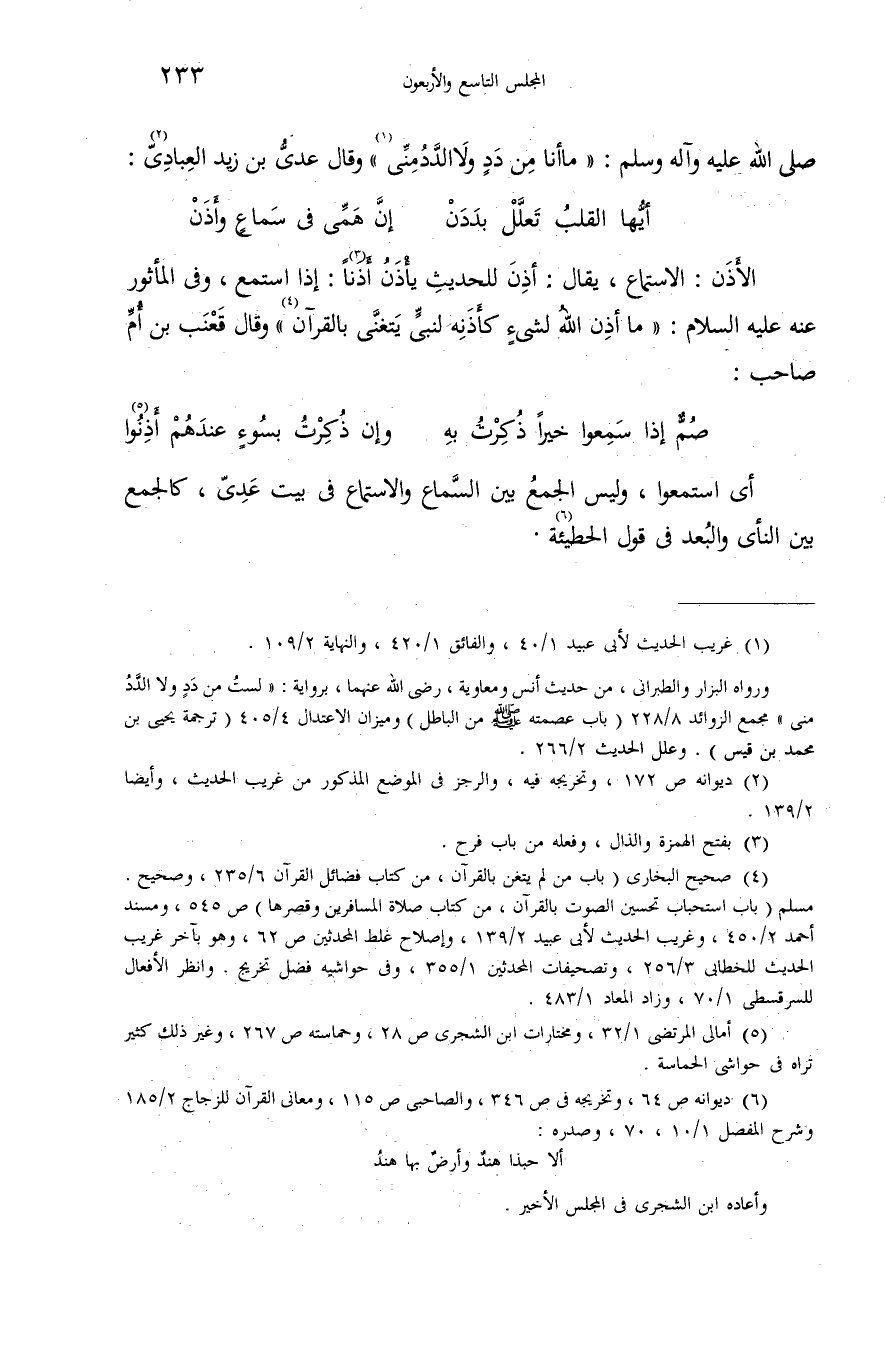 أى استمعوا، وليس الجمع بين السّماع والاستماع فى بيت عدىّ، كالجمع بين النأى والبعد فى قول الحطيئة (¬6).