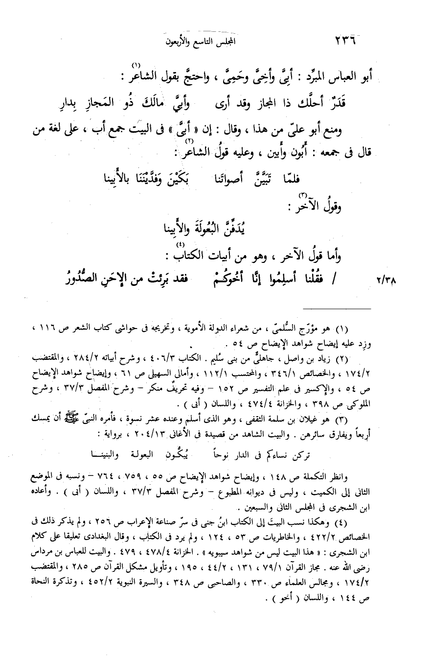 (¬4) وهكذا نسب البيت إلى الكتاب ابن جنى فى سرّ صناعة الإعراب ص 256، ولم يذكر ذلك فى الخصائص 2/ 422، والخاطريات ص 53،124، ولم يرد فى الكتاب، وقال البغدادى تعليقا على كلام ابن الشجرى: «هذا البيت ليس من شواهد سيبويه». الخزانة 4/ 478،479. والبيت للعباس بن مرداس رضى الله عنه. مجاز القرآن 1/ 79،131،2/ 44،195، وتأويل مشكل القرآن ص 285، والمقتضب 2/ 174، ومجالس العلماء ص 330، والصاحبى ص 348، والسيرة النبوية 2/ 452، وتذكرة النحاة ص 144، واللسان (أخو).