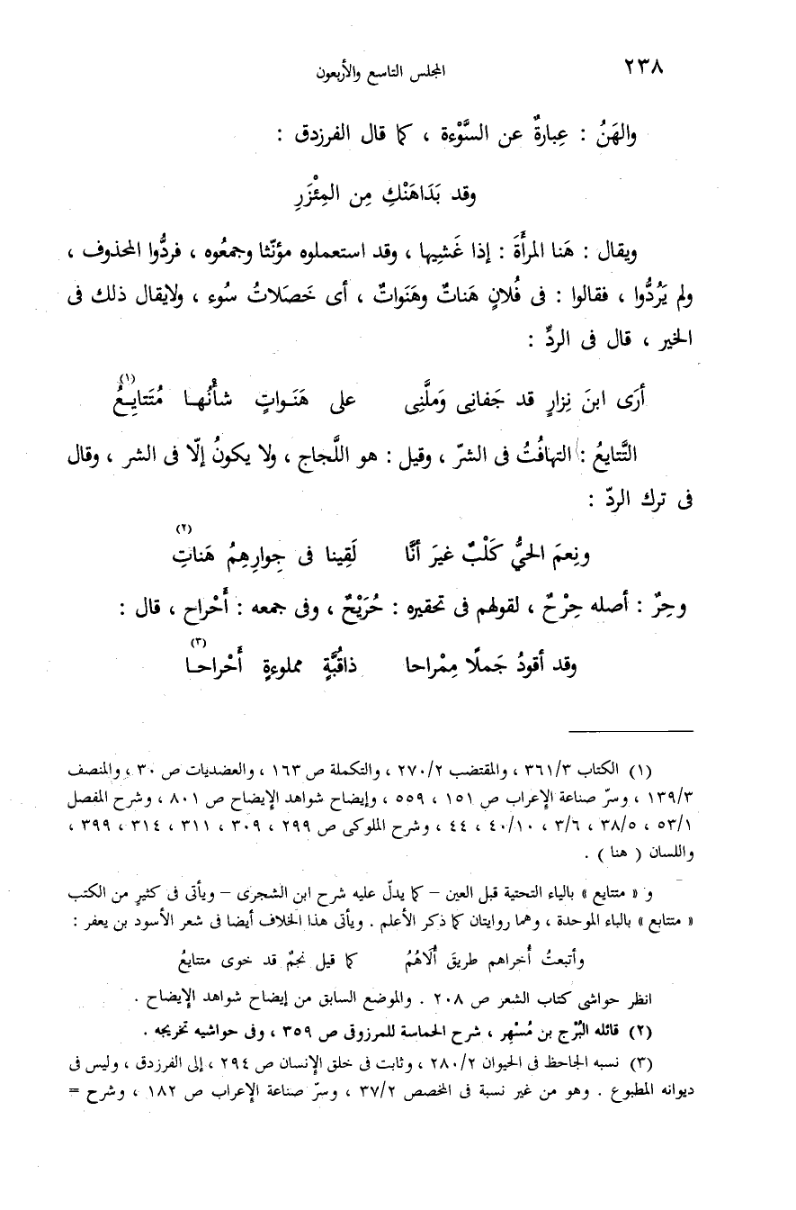 (¬1) الكتاب 3/ 361، والمقتضب 2/ 270، والتكملة ص 163، والعضديات ص 30، والمنصف 3/ 139، وسرّ صناعة الإعراب ص 151،559، وإيضاح شواهد الإيضاح ص 801، وشرح المفصل 1/ 53،5/ 38،6/ 3،10/ 40،44، وشرح الملوكى ص 299،309،311،314،399، واللسان (هنا). و «متتابع» بالياء التحتية قبل العين-كما يدلّ عليه شرح ابن الشجرى-ويأتى فى كثير من الكتب «متتابع» بالباء الموحدة، وهما روايتان كما ذكر الأعلم. ويأتى هذا الخلاف أيضا فى شعر الأسود بن يعفر: وأتبعت أخراهم طريق ألاهم كما قيل نجم قد خوى متتايع انظر حواشى كتاب الشعر ص 208. والموضع السابق من إيضاح شواهد الإيضاح.