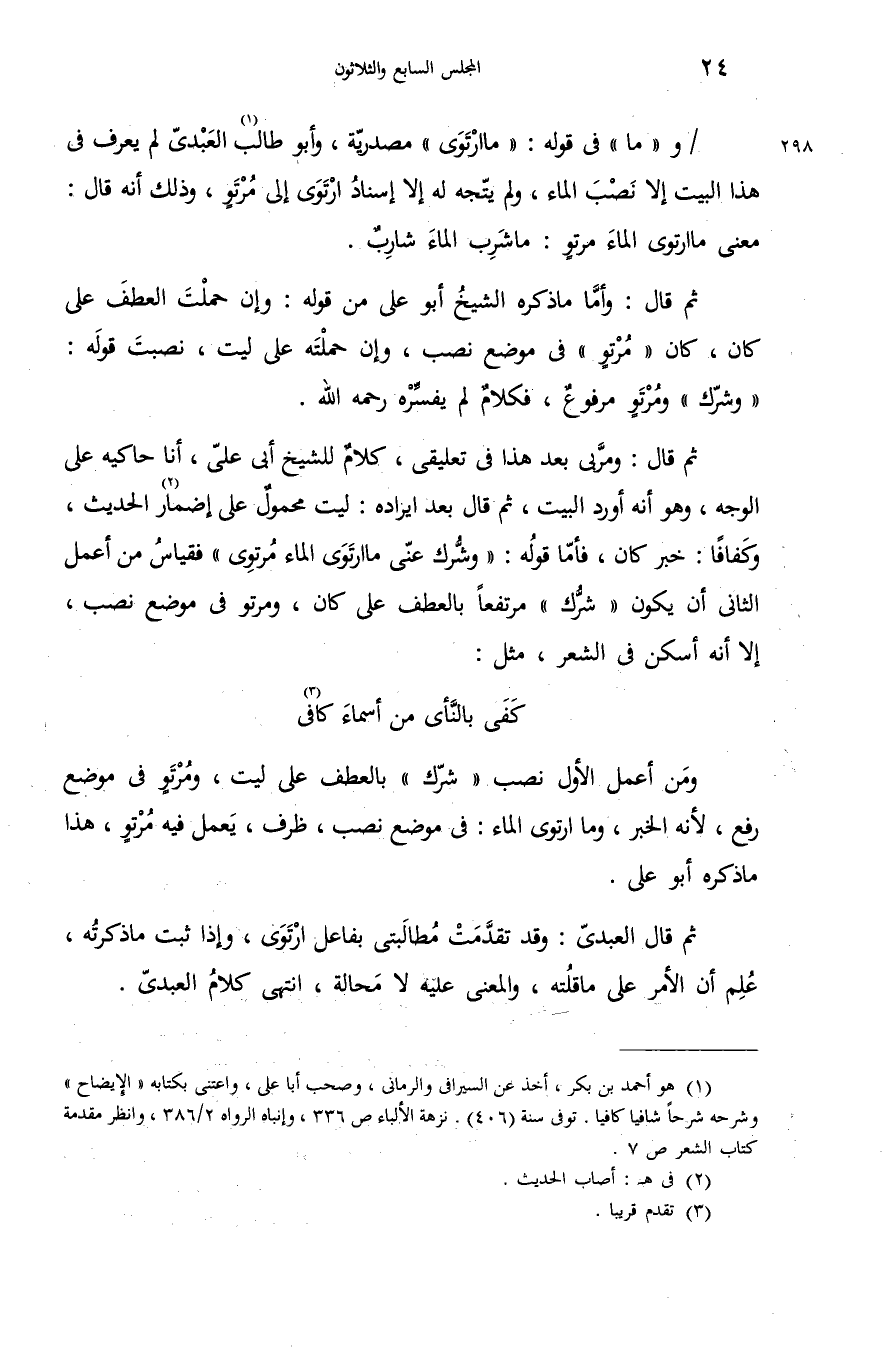 ثم قال العبدىّ: وقد تقدّمت مطالبتى بفاعل ارتوى، وإذا ثبت ما ذكرته، علم أن الأمر على ما قلته، والمعنى عليه لا محالة، انتهى كلام العبدىّ.