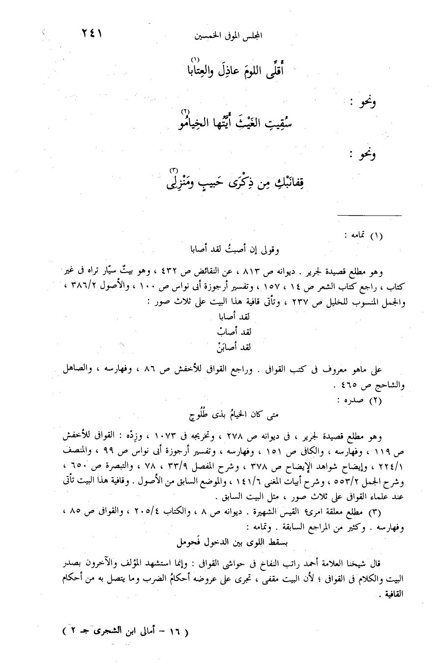 (¬3) مطلع معلقة امرئ القيس الشهيرة. ديوانه ص 8، والكتاب 4/ 205، والقوافى ص 85، وفهارسه. وكثير من المراجع السابقة. وتمامه: بسقط اللوى بين الدخول فحومل قال شيخنا العلامة أحمد راتب النفاخ فى حواشى القوافى: وإنما استشهد المؤلف والآخرون بصدر البيت والكلام فى القوافى؛ لأن البيت مقفى، تجرى على عروضه أحكام الضرب وما يتصل به من أحكام القافية.