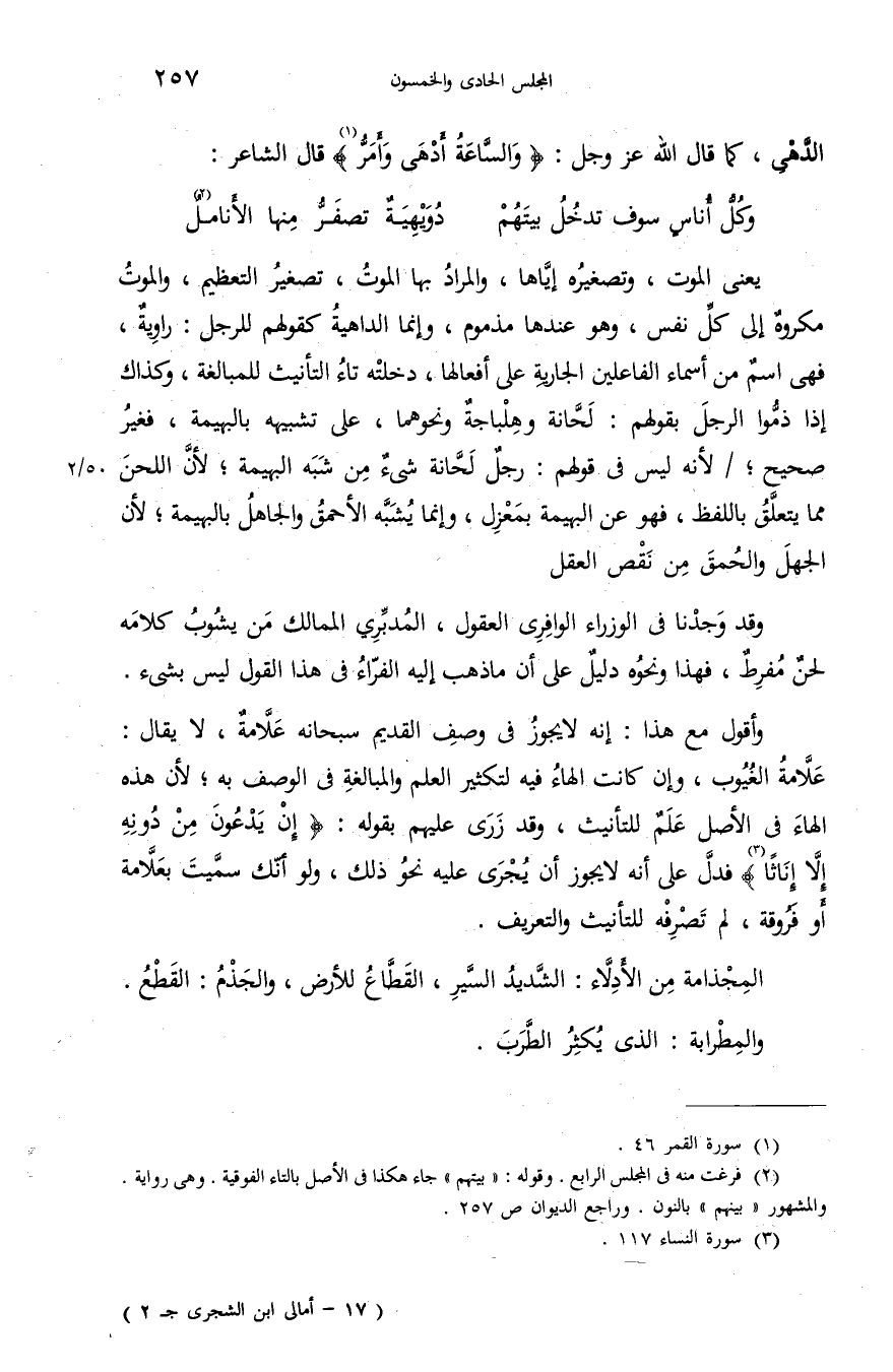 يعنى الموت، وتصغيره إيّاها، والمراد بها الموت، تصغير التعظيم، والموت مكروه إلى كلّ نفس، وهو عندها مذموم، وإنما الداهية كقولهم للرجل: راوية، فهى اسم من أسماء الفاعلين الجارية على أفعالها، دخلته تاء التأنيث للمبالغة، وكذاك إذا ذمّوا الرجل بقولهم: لحّانة وهلباجة ونحوهما، على تشبيهه بالبهيمة، فغير صحيح؛ /لأنه ليس فى قولهم: رجل لحّانة شيء من شبه البهيمة؛ لأنّ اللحن مما يتعلّق باللفظ، فهو عن البهيمة بمعزل، وإنما يشبّه الأحمق والجاهل بالبهيمة؛ لأن الجهل والحمق من نقص العقل