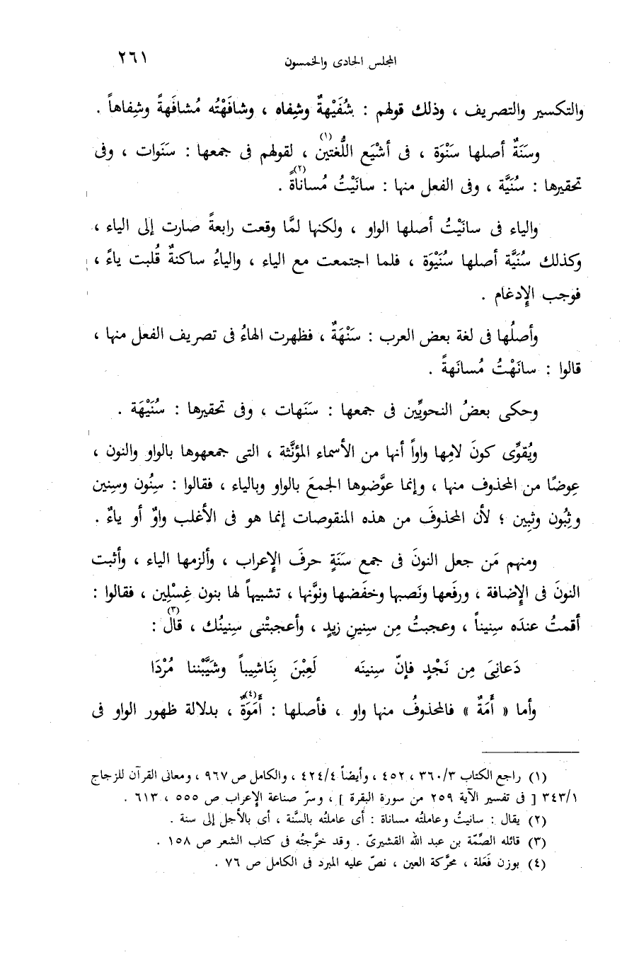 وسنة أصلها سنوة، فى أشيع اللّغتين (¬1)، لقولهم فى جمعها: سنوات، وفى تحقيرها: سنيّة، وفى الفعل منها: سانيت مساناة (¬2).