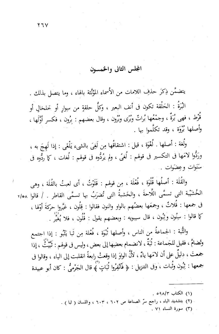 والثّبة: الجماعة من الناس، وأصلها ثبوة، فعلة من ثبا يثبو: إذا اجتمع وتضامّ، فقيل للجماعة: ثبة، لانضمام بعضها إلى بعض، وليس فى قولهم: ثبّيت (¬2)، إذا جمعت، دليل على أن لامها ياء، لأنّ الواو إذا وقعت رابعة انقلبت إلى الياء، وقالوا فى جمعها: ثبون وثبات، وفى التنزيل: {فَانْفِرُوا ثُباتٍ} (¬3) قال الجرمىّ: كان أبو عبيدة