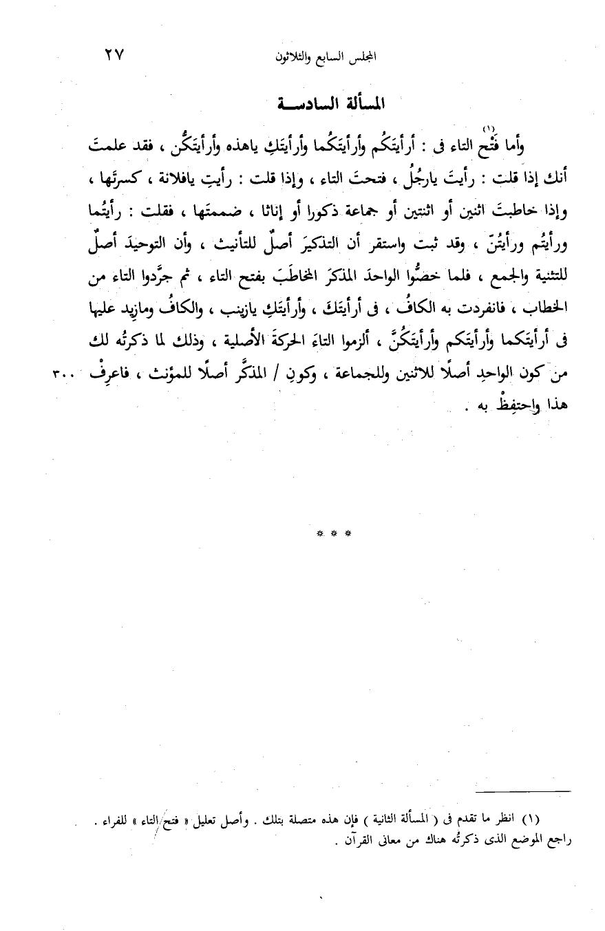 (¬1) انظر ما تقدم فى (المسألة الثانية) فإن هذه متصلة بتلك. وأصل تعليل «فتح التاء» للفراء. راجع الموضع الذى ذكرته هناك من معانى القرآن.