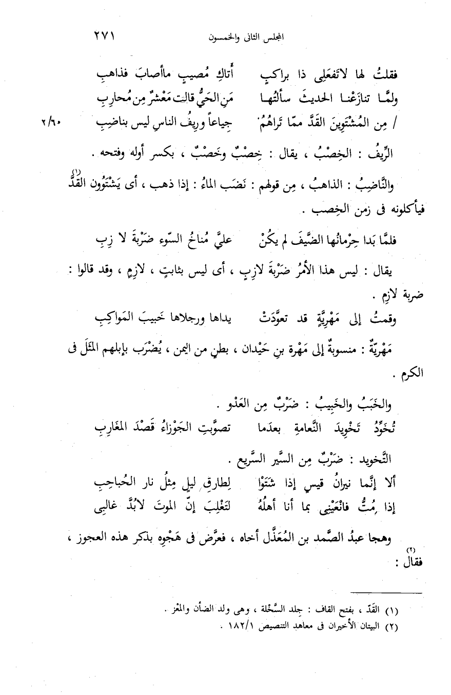 والنّاضب: الذاهب، من قولهم: نضب الماء: إذا ذهب، أى يشتوون القدّ (¬1) فيأكلونه فى زمن الخصب.