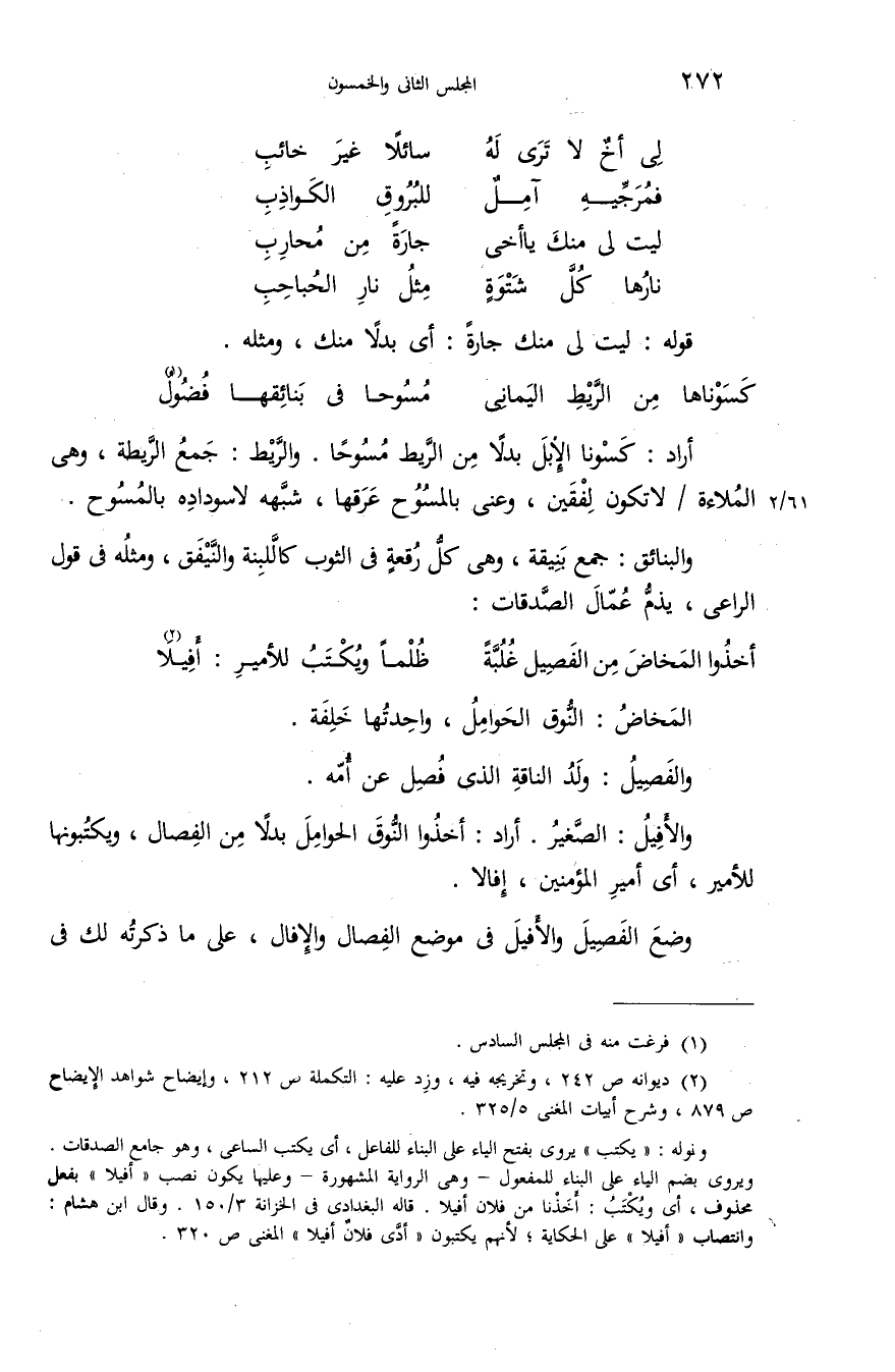 (¬2) ديوانه ص 242، وتخريجه فيه، وزد عليه: التكملة ص 212، وإيضاح شواهد الإيضاح ص 879، وشرح أبيات المغنى 5/ 325. وقوله: «يكتب» يروى بفتح الياء على البناء للفاعل، أى يكتب الساعى، وهو جامع الصدقات. ويروى بضم الياء على البناء للمفعول-وهى الرواية المشهورة-وعليها يكون نصب «أفيلا» بفعل محذوف، أى ويكتب: أخذنا من فلان أفيلا. قاله البغدادى فى الخزانة 3/ 150. وقال ابن هشام: وانتصاب «أفيلا» على الحكاية؛ لأنهم يكتبون «أدّى فلان أفيلا» المغنى ص 320.