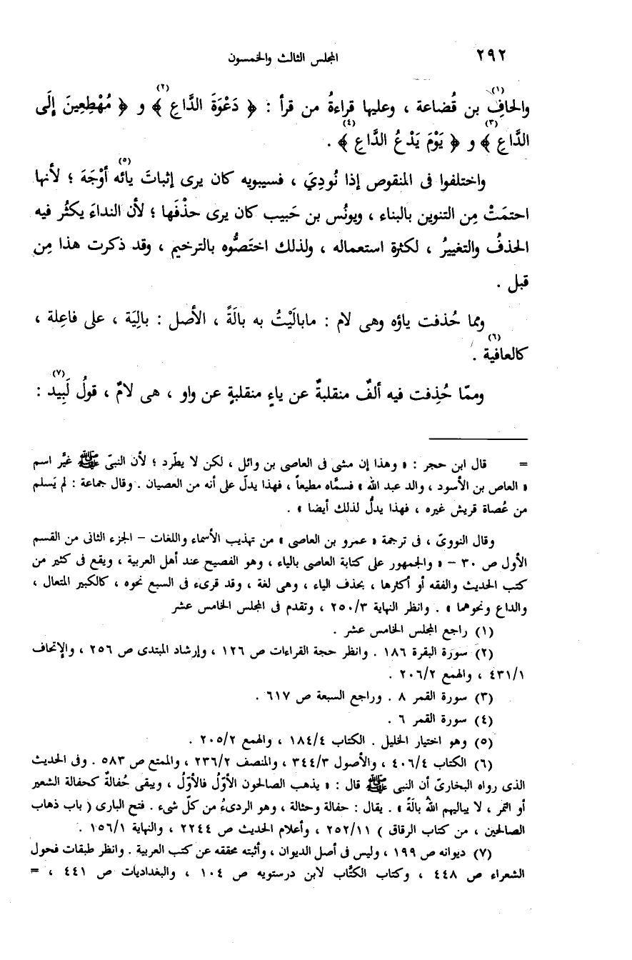 = قال ابن حجر: «وهذا إن مشى فى العاصى بن وائل، لكن لا يطّرد؛ لأن النبىّ صلّى الله عليه وسلم غيّر اسم «العاص بن الأسود، والد عبد الله» فسمّاه مطيعا، فهذا يدلّ على أنه من العصيان. وقال جماعة: لم يسلم من عصاة قريش غيره، فهذا يدلّ لذلك أيضا». وقال النووىّ، فى ترجمة «عمرو بن العاصى» من تهذيب الأسماء واللغات-الجزء الثانى من القسم الأول ص 30 - «والجمهور على كتابة العاصى بالياء، وهو الفصيح عند أهل العربية، ويقع فى كثير من كتب الحديث والفقه أو أكثرها، بحذف الياء، وهى لغة، وقد قرئ فى السبع نحوه، كالكبير المتعال، والداع ونحوهما». وانظر النهاية 3/ 250، وتقدم فى المجلس الخامس عشر