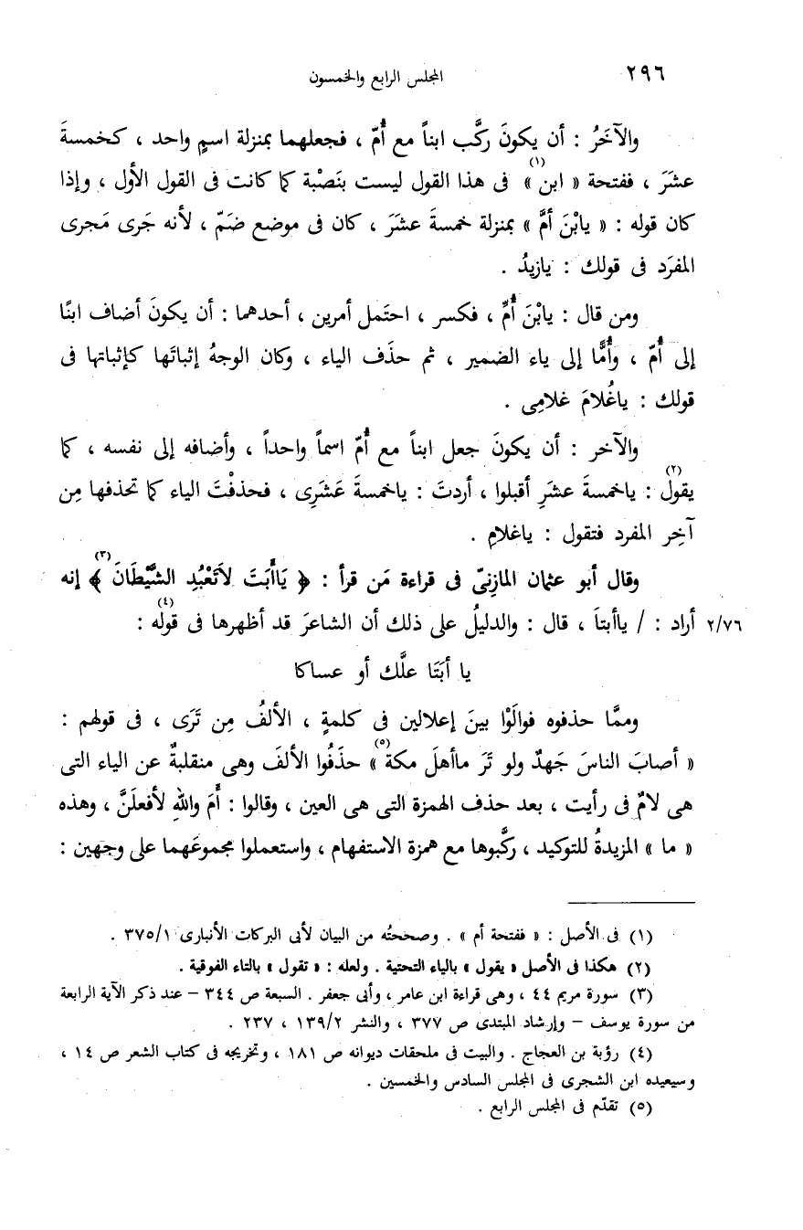 والآخر: أن يكون جعل ابنا مع أمّ اسما واحدا، وأضافه إلى نفسه، كما يقول (¬2): يا خمسة عشر أقبلوا، أردت: يا خمسة عشرى، فحذفت الياء كما تحذفها من آخر المفرد فتقول: يا غلام.