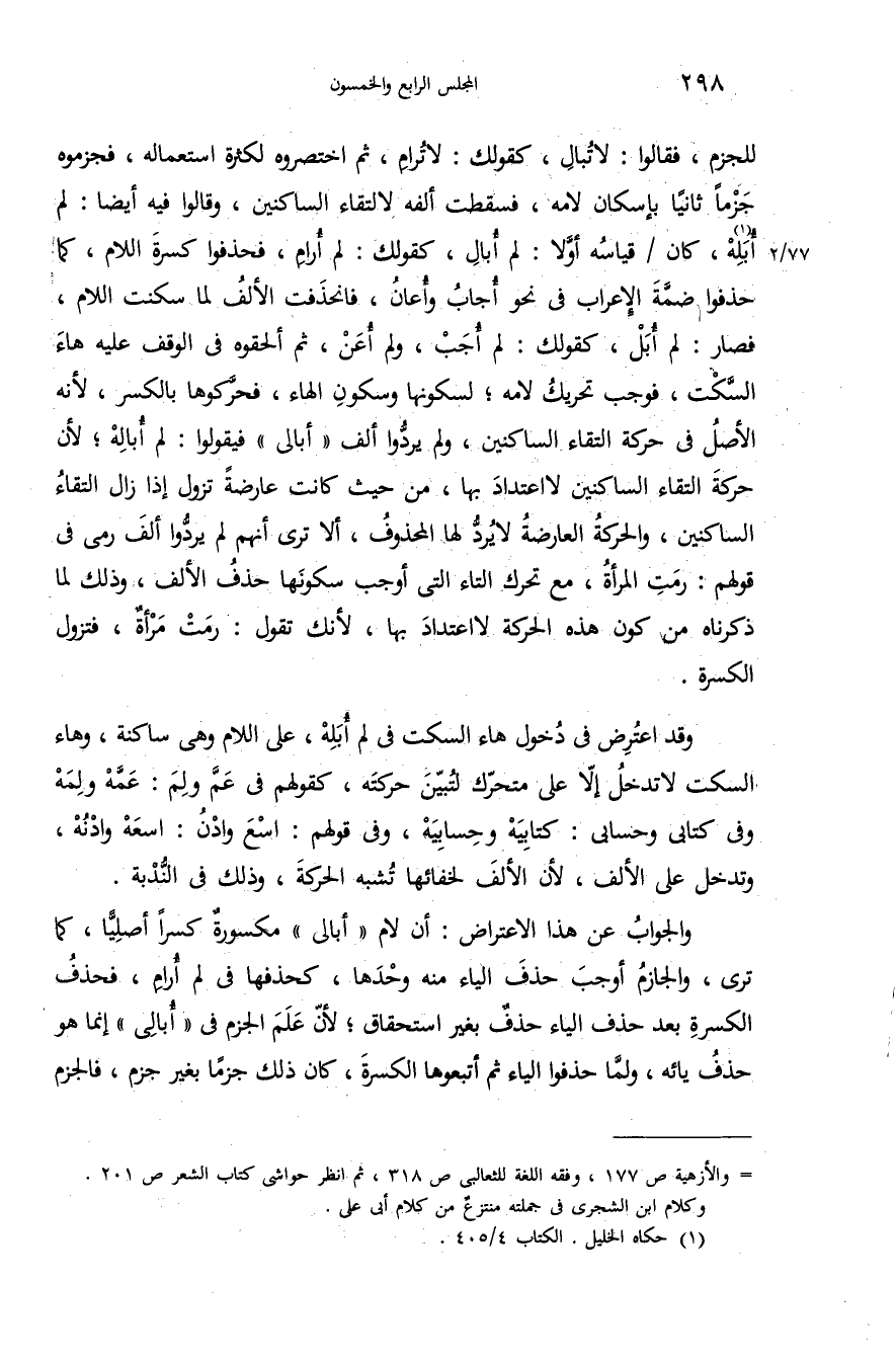 وقد اعترض فى دخول هاء السكت فى لم أبله، على اللام وهى ساكنة، وهاء السكت لا تدخل إلاّ على متحرّك لتبيّن حركته، كقولهم فى عمّ ولم: عمّه ولمه وفى كتابى وحسابى: كتابيه وحسابيه، وفى قولهم: اسع وادن: اسعه وادنه، وتدخل على الألف، لأن الألف لخفائها تشبه الحركة، وذلك فى النّدبة.